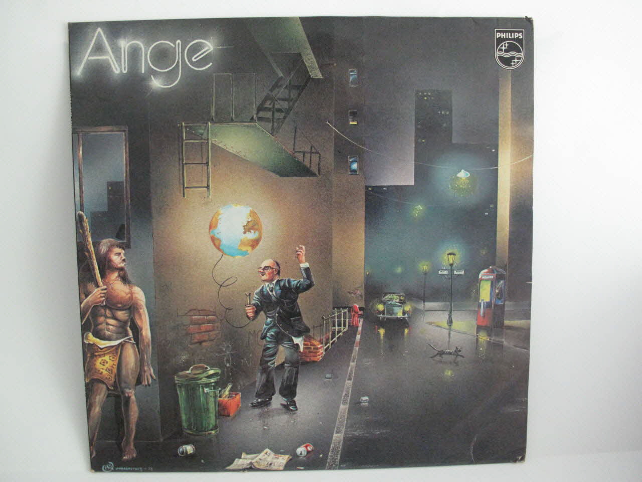 enveloppe de protection et encart / pochette / disque, de couleur noire / au recto de la pochette, dessin mettant en scène un personnage semblant chanter et tenant par une ficelle un globe lumineux, dans un décor nocturne et hostile - au verso de la pochette, le meme personnage git au sol suite à une agression / encart sur double page, de même format que celui de la pochette - jeu de l'oie original comportant soixante quatre cases et sa règle du jeu / sur l'enveloppe de protection, paroles des chansons écrites sur fond vert - dessin en blanc d'un visage vu de profil