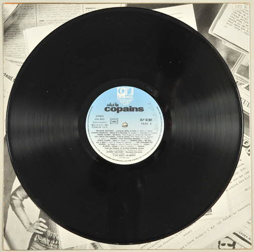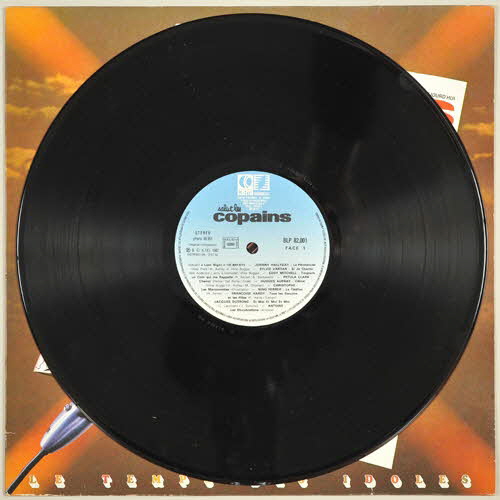 disque en vinyle de couleur noire / pochette en carton / enveloppe de protection en papier / au recto de la pochette, sur ce qui pourrait être une couverture du magazine "Salut les copains", noms des "idoles" dont une chanson est inclus dans le disque - photographie partielle d'un disque vinyle - au premier plan, photographie d'un micro portant une étiquette "Europe 1" - fond représentant un ciel orangé - au dos de la pochette, titre des chansons et liste des participants / disque vinyle de couleur noire - inscriptions noires sur fond bleu sur la partie centraleInscriptions