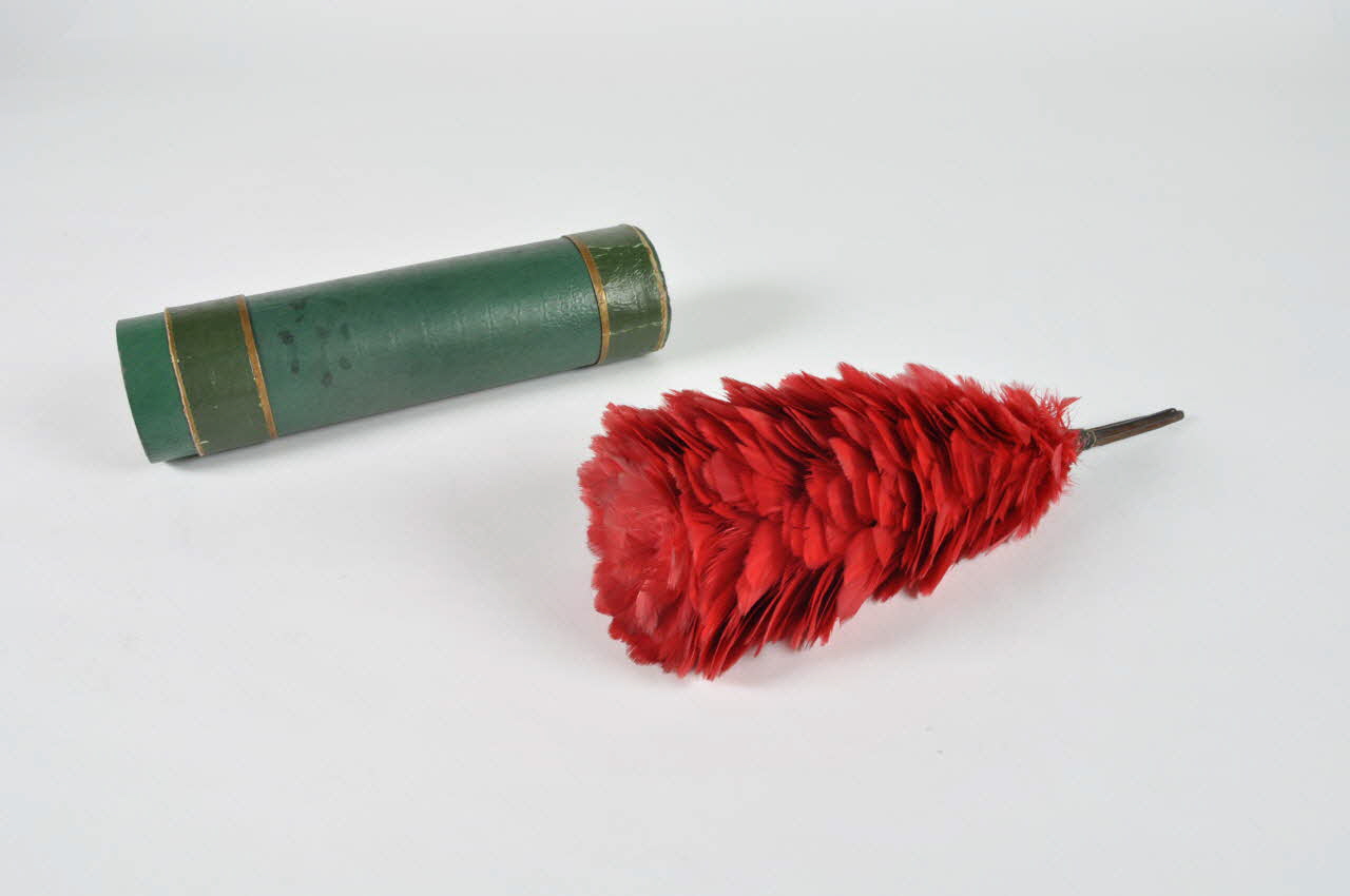 Elément du costume de bravadeur en plume rouge. De forme évasée, il possède une tige en métal pour être fiché sur le costume. Son étui est en carton peint en vert.Matériaux et techniques