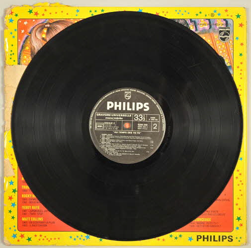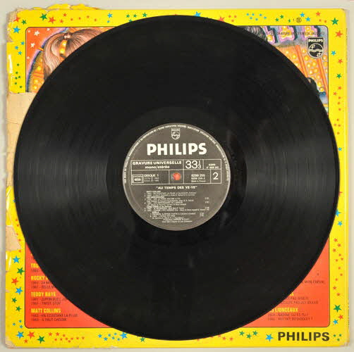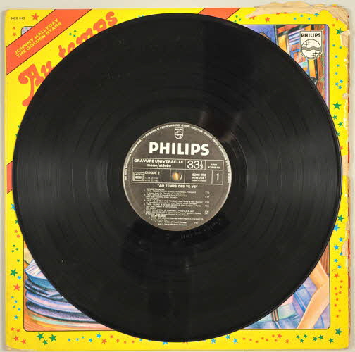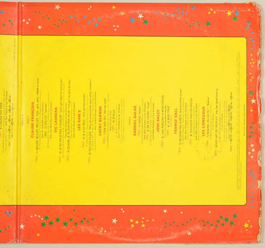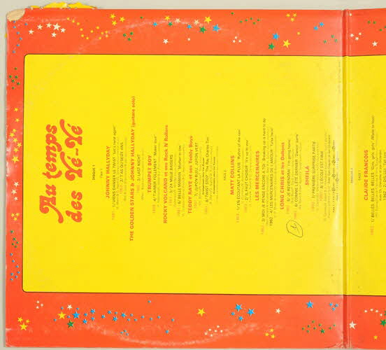 enveloppe de protection en papier / pochette en carton / disque vinyle de couleur noire / pochette double - au recto, encadré d'étoiles sur fond jaune : dessin très coloré de personnages dansant et au volant de voitures - ambiance de fête - à l'intérieur de la pochette, titres des chansons sur fond jaune entourés d'étoiles colorées sur fond rouge - au verso, dessin de personnages dans une ambiance de fête dont deux musiciens et titre des chansons avec année de sortieInscriptions