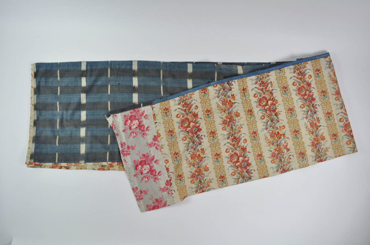 Grand rectangle de toile flammée bleu et blanc, doublée d'une étoffe de coton imprimée de motifs floraux.Matériaux et techniques