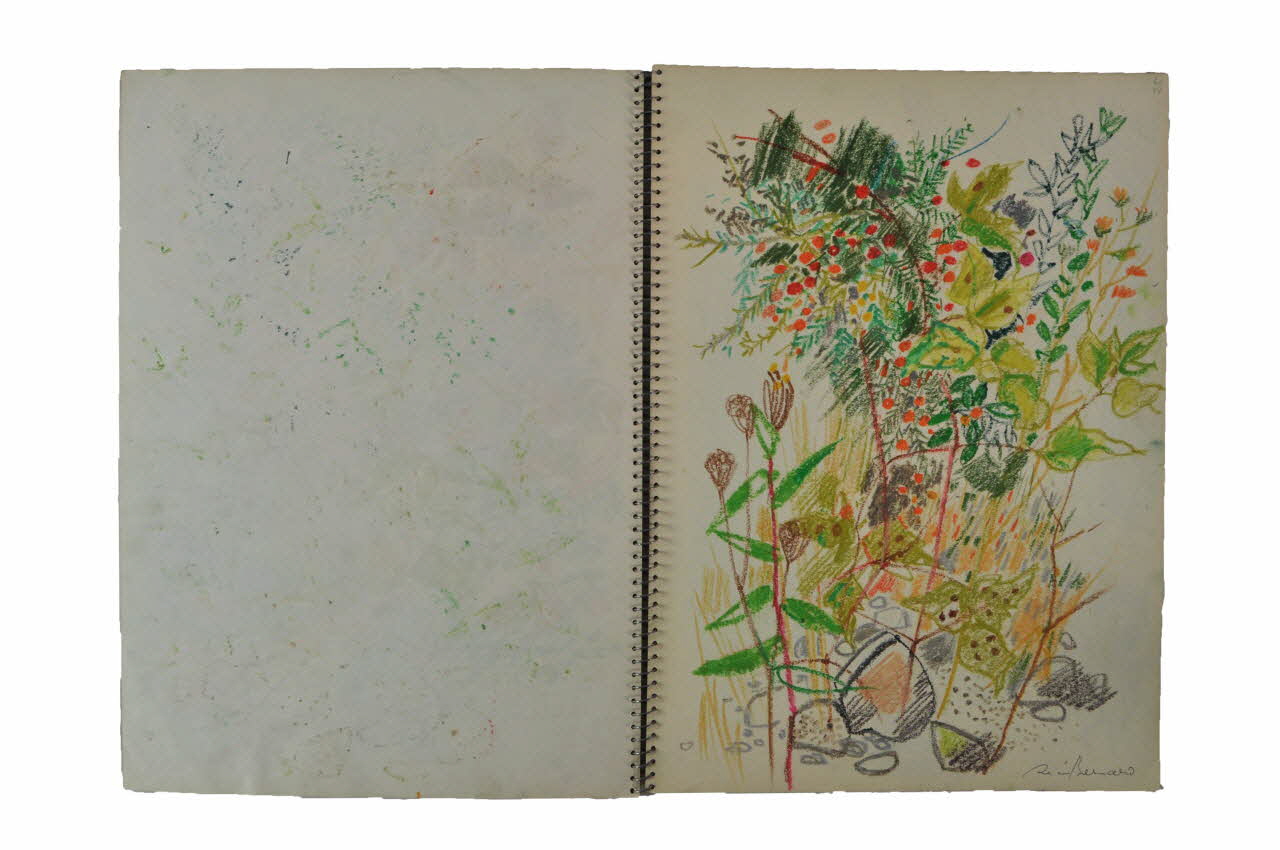 Les deux feuilles cartonnées constituant la couverture sont de couleur marron sur leur face extérieure et de couleur beige/rosé sur leur face intérieure. Les pages sont numérotées au crayon de 1 à 28. La page dix-huit est manquante. Les dessins sont faits au pastel, à la gouache et à l'encre noire. Ce carnet, entièrement rempli, contient essentiellement des paysages que l'artiste a traité sur le vif en associant plusieurs techniques avec une grande variété de couleurs franches et relevées. Les dessins sont tous signés au stylo noir. Sur la plupart est noté le nom du lieu reproduit. La couverture de devant présente des inscriptions notées au feutre noir. Il s'agit du nom des lieux visités par l'artiste. Le nom de l'artiste est noté dans le bas. Un coeur est également présent dans l'angle supérieur droit ainsi que la lettre "R". On note la présence d'un tampon dans l'angle supérieur droit. La troisième page de couverture comprend des annotations sous la forme d'un calendrier. La dernière page de couverture présente une marque à l'encre noire dans le bas.Inscriptions