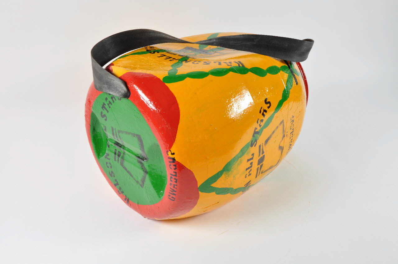 Bidon en plastique, de section circulaire aux quatre faces applaties, à fond plat enfoncé en deux endroits sur les bords et à col formé de deux bourrelet. Deux trous, un percé en haut, sous le col, et un percé en bas, sur le bord de la base, servent à fixer une bandoulière large et noire. Le bidon, présenté à l'envers, ouverture vers le bas, est peint avec une bande rouge en bas, une vague rouge en haut, le dessus en vert, la panse en jaune avec un motif de corde verte en trompe l'oeil formant des croisillons. On trouve sur chaque face et sur le dessus un motif de short et une inscription réalisée à la peinture noire au pochoir. L'intérieur du bidon laisse voir la couleur bleue d'origine du bidon. Il est tenu par une ceinture.Inscriptions