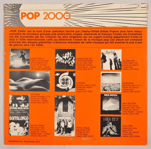 LBX 6 F (référence de l'album)face 1 : // - Amon Düül II, Flesh coloured anti-aircraft alarm, extrait du double album "Yeti" // - Cochise, Velvet Mountain, extrait de l'album "Cochise" // - Boffalongo, Dancing in the moonlight, extrait de l'album "Boffalongo" // - Damnation of Adam Blessing, Money tree, extrait de l'album "Damnation" // - Fantasy, Stone cowboy, extrait de l'album "Fantasy" // // face 2 : // - Total Issue, Hauteville, extrait du 45 t "Total Issue" // - Sugarloaf, Chest fever, extrait de l'album "Sugarloaf" // - Hawkwind, Paranoïa (part 2), extrait de l'album "Hawkwind" // - Wild Butter, New York mining disaster 1941, extrait de l'album "Wild Butter" // - High Tide, Blackman cries again, extrait de l'album "High Tide" (titre des chansons // 10 titres)Décor