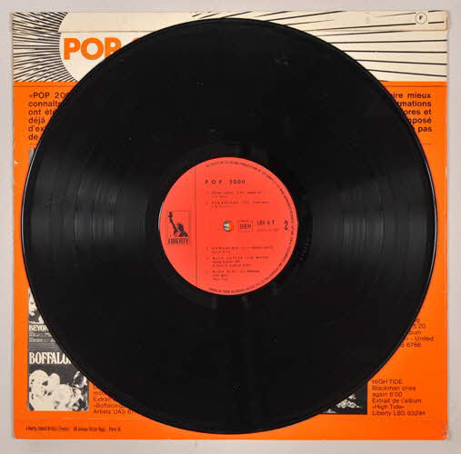 disque en vinyle / pochette en carton / au recto de la pochette, motif de spirale noir et blanc en fond - logo de la maison de disque en noir et blanc - titre de l'album et nom des groupes représentés en lettres oranges - au verso de la pochette, photographie des dix albums représentés - fond orange - texte de présentation de l'opération "pop 2000" / disque en vinyle de couleur noire - inscriptions noires sur fond rouge sur la partie centraleInscriptions