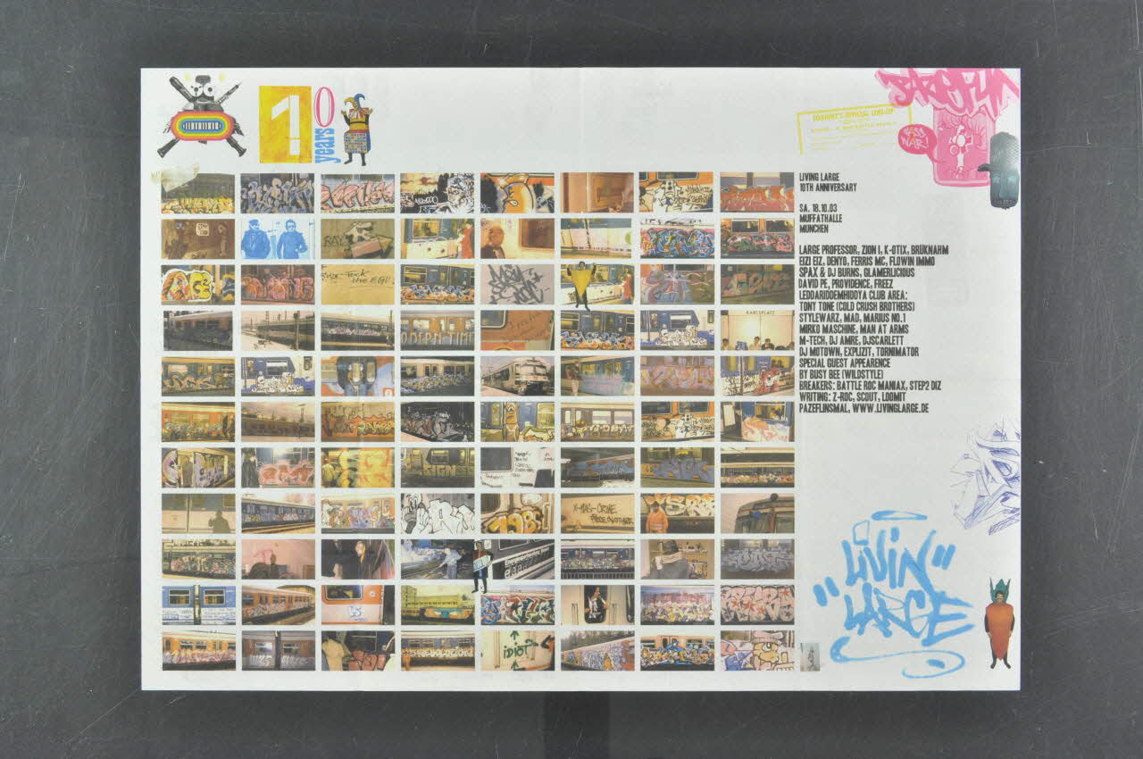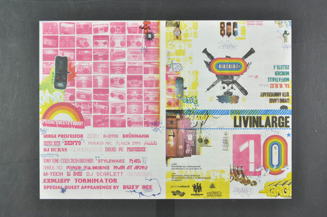 Feuille de papier imprimée en couleurs et pliée en quatre volets dans le sens de la largeur et une fois dans le sens de la longueur. Ce programme présente des évènements culturels organisés par "LIVINLARGE" à l'occasion de leur 10 ème anniversaire. Il se compose d'une série de photographies sous forme de petites vignettes, de dessins de graffitis et d'inscriptions.Décor