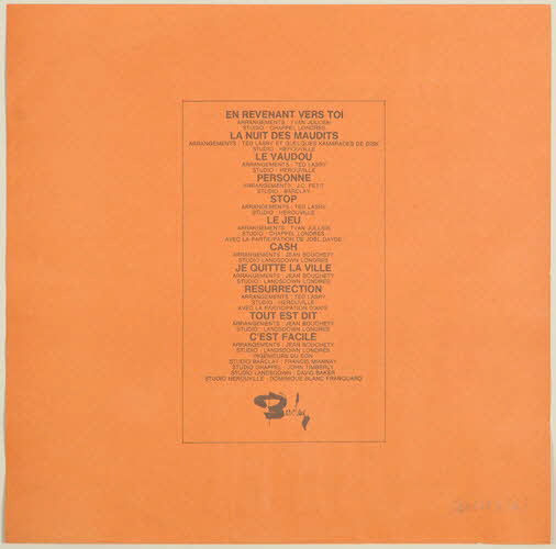 arrangements / ingénieur du son, Studio Barclay / studio d'enregistrement / ingénieur du son, Studio Landsdown / arrangements / studio d'enregistrement / studio d'enregistrement / arrangements / ingénieur du son, Studio Chappel / studio d'enregistrement / ingénieur du son (Studio Herouville) / arrangements / direction artistique / maison de disques // au recto de la pochette, en lettres capitales on peut lire : "FABRICATION FRANCAISE"