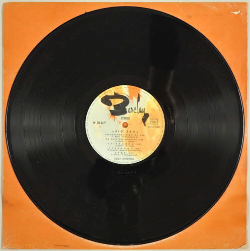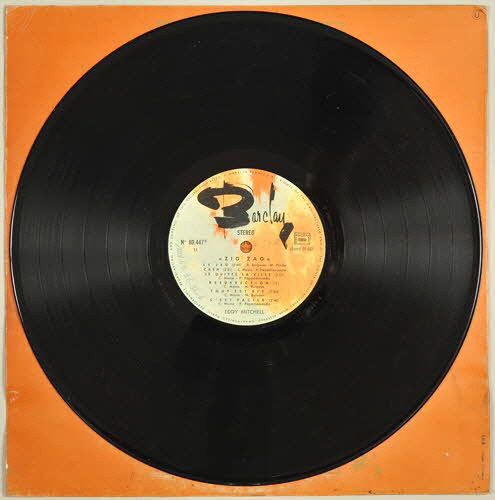 encart et enveloppe de protection en papier / pochette en carton / disque en vinyle de couleur noir / au recto de la pochette, sur fond orange, à l'intérieur d'une sorte de médaillon doré, dessin d'Eddy Mitchell en noir et orange en train de fumer une cigarette - en haut du dessin, référence et titre de l'album - sous le dessin, nom de l'artiste et mention du nombre de chansons contenues dans le disque - au dos de la pochette, sur fond orange et à l'intérieur d'un cadre doré, titre des chansons et texte d'Eddy Mitchell relatif aux styles musicaux de son disque / disque de couleur noire - motif dans les tons de jaune et orange et signature spécifique de la maison Barclay - enveloppe de protection en papier blanc / sur une face de l'encart, photographie en noir et orange d'Eddy Mitchell posant devant un support contenant des fusils - au dos de l'encart, sur fond orange, titre des chansons et informations relatives aux studios d'enregistrementsInscriptions