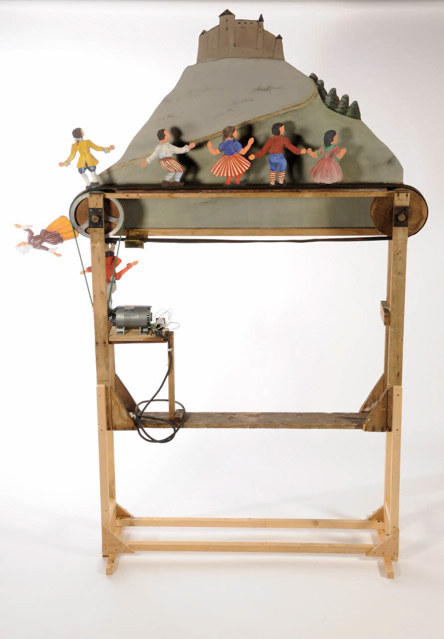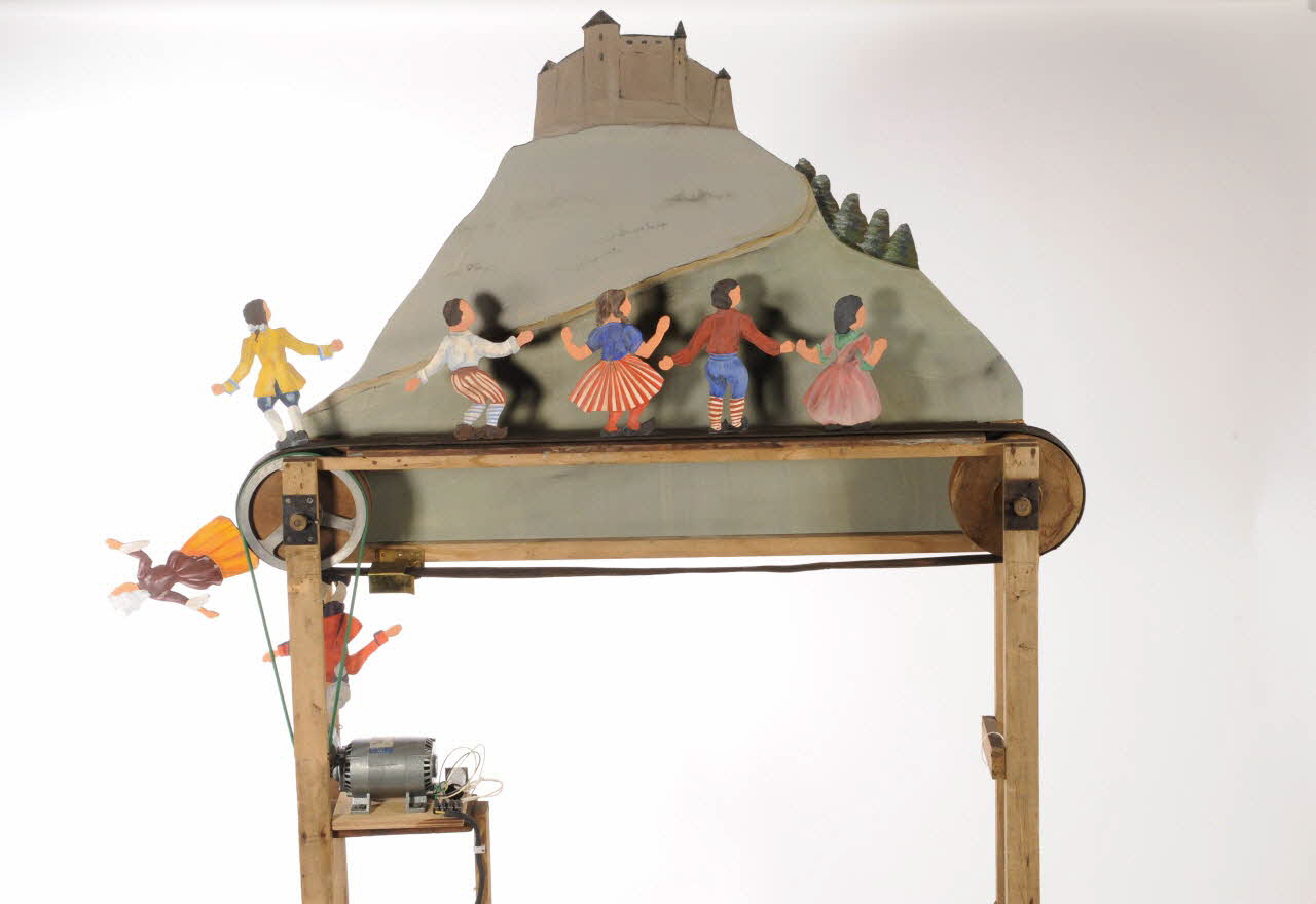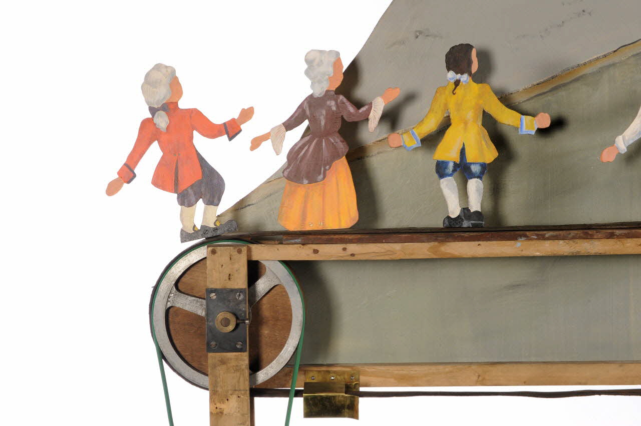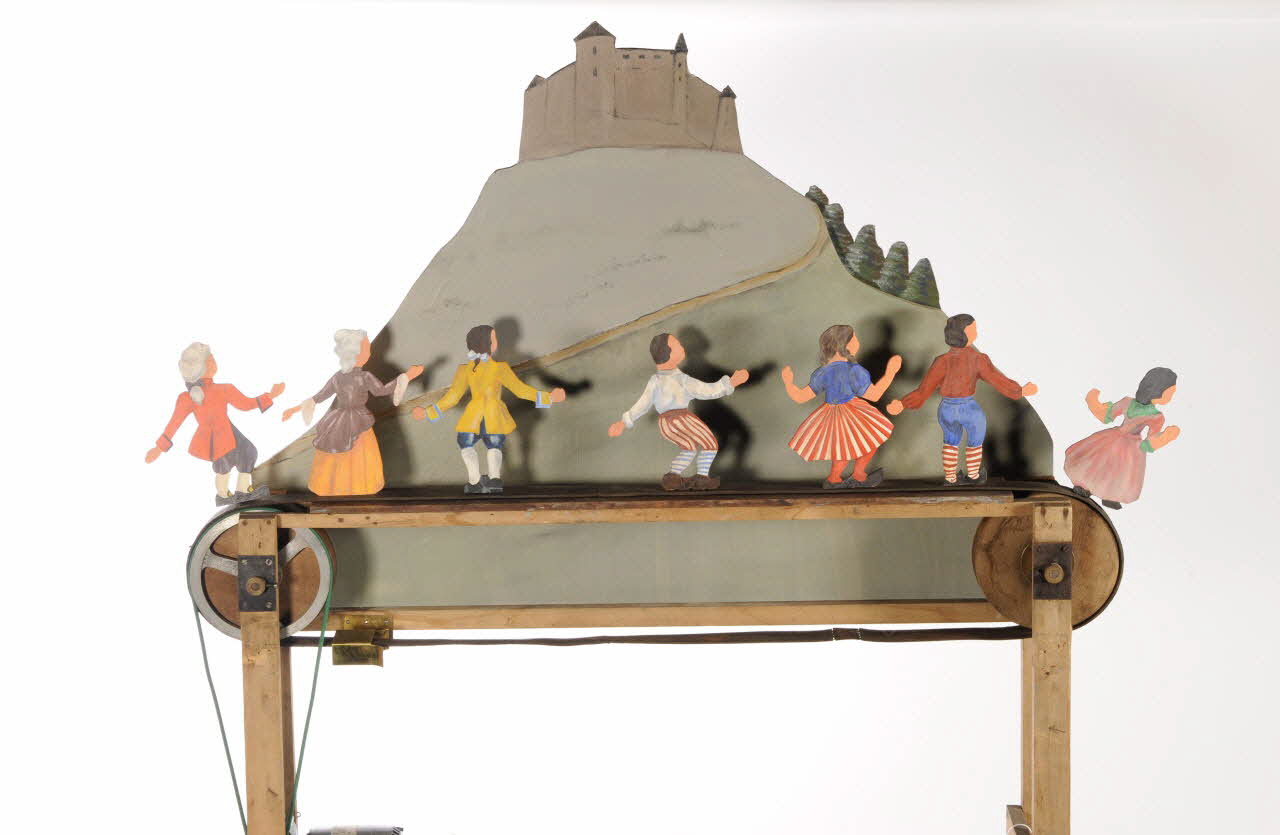 Un défilé de sept silhouettes devant un décor figurant une montagne au sommet de laquelle se trouve un château.Matériaux et techniques