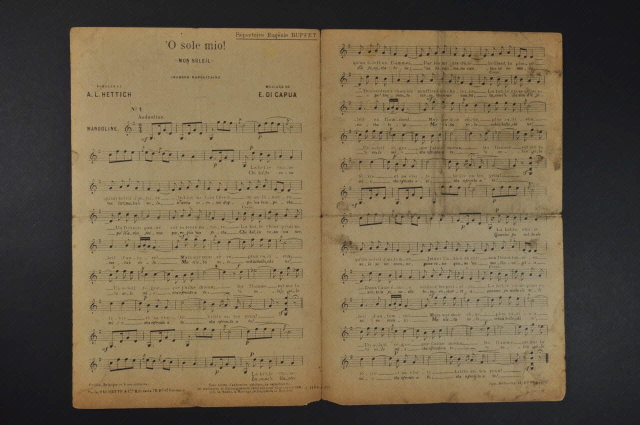 Des inscriptions renseignent le titre, les auteurs, les exécutants et l'éditeur. A l'intérieur, la partition et les paroles. Le dos est laissé vierge.Matériaux et techniques