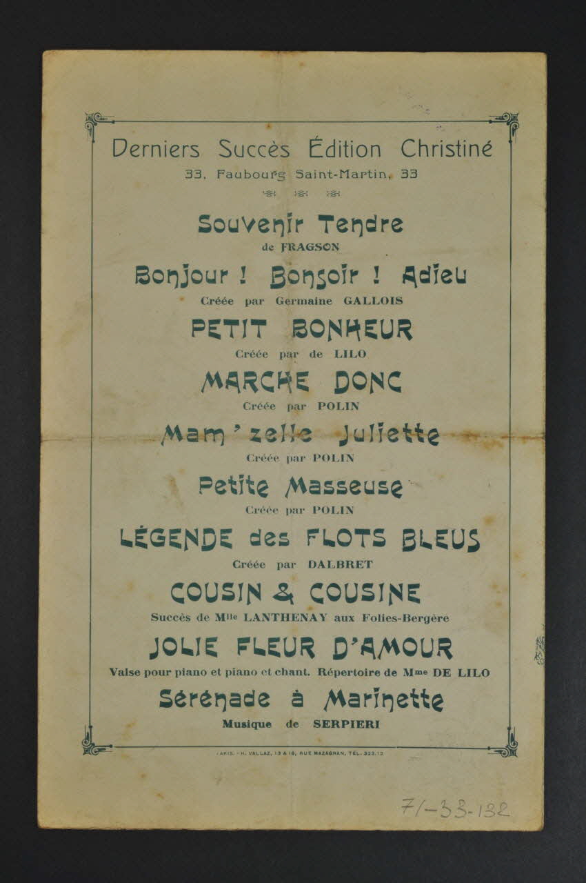 Les inscriptions renseignent le titre de la chanson, le nom des auteurs, de l'artiste et de l'éditeur. A l'intérieur, partitions et paroles de la chanson. Au dos, liste d?autres partitions publiées par l?éditeur.Dimensions et poids