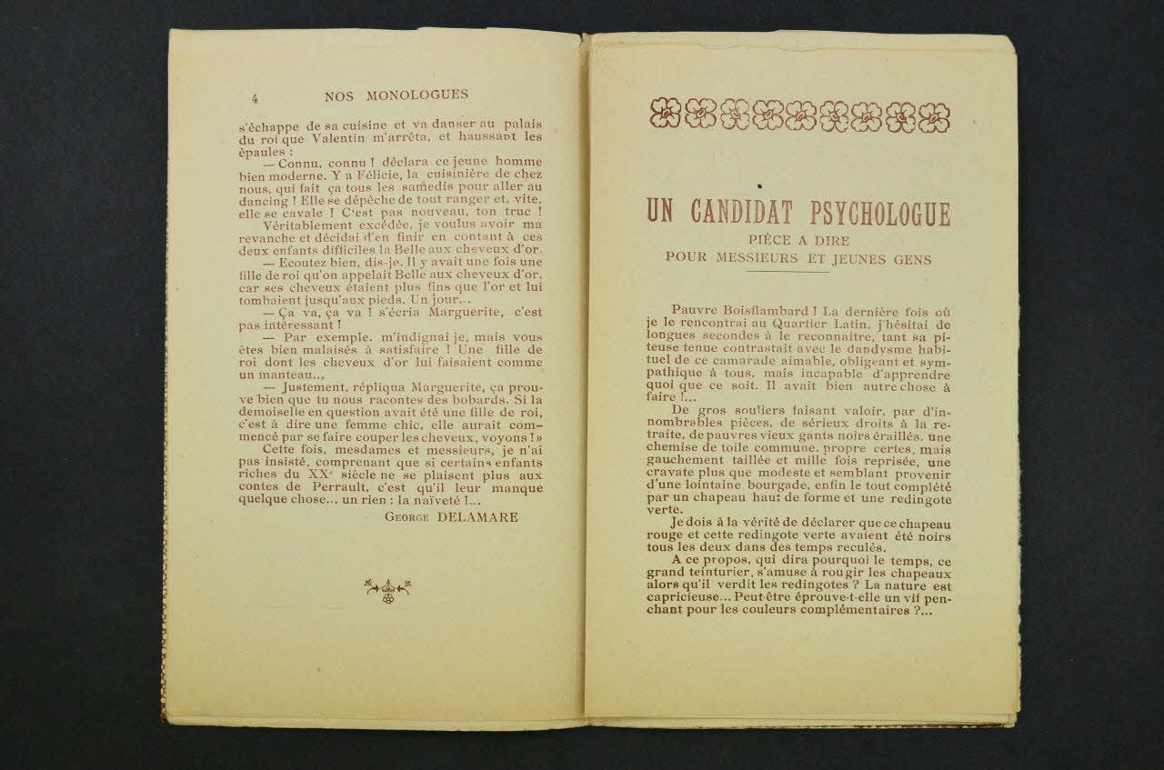 Sur la couverture, dans un encadrement à motifs de résilles, les inscriptions renseignent le titre de la publication, le nom de l'éditeur et le sommaire. A l'intérieur, textes de monologues. Sur la deuxième page, le sommaire des numéros parus. Au dos, description de la nature de la publication "Nos Monologues".Matériaux et techniques