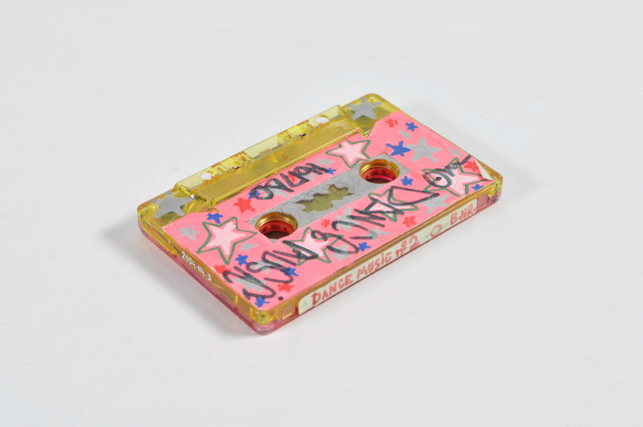 Cassette audio en plastique jaune et rose translucide, recouverte de papier peint. Sur une face figure une étiquette rose, ornée d'étoiles bleues, rouges et argentées. Sur l'autre, des bandes de papier jaune, vert et noir présentent de nombreuses inscriptions au feutre.Inscriptions