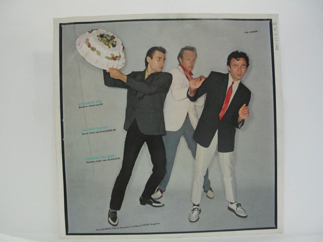 enveloppe de protection / pochette / disque / au recto de la pochette, trois photographies en couleur des trois musiciens du grope "Bijou" sur fond gris - au dos de la pochette, photographies d'albums du groupe, titre des chansons et informations relatives à la réalisation de l'album / sur une face de l'enveloppe de protection, photographie des trois musiciens du groupe, sur l'autre face, photographie en noir et blanc de l'équipe technique avec le nom de chaque personne : Mac Telliam (sono), Jean Luc Garellou (retours), Philippe Cognet (matériel de scène), Jacques Lebihan et Michel Astre (chauffeurs)Inscriptions