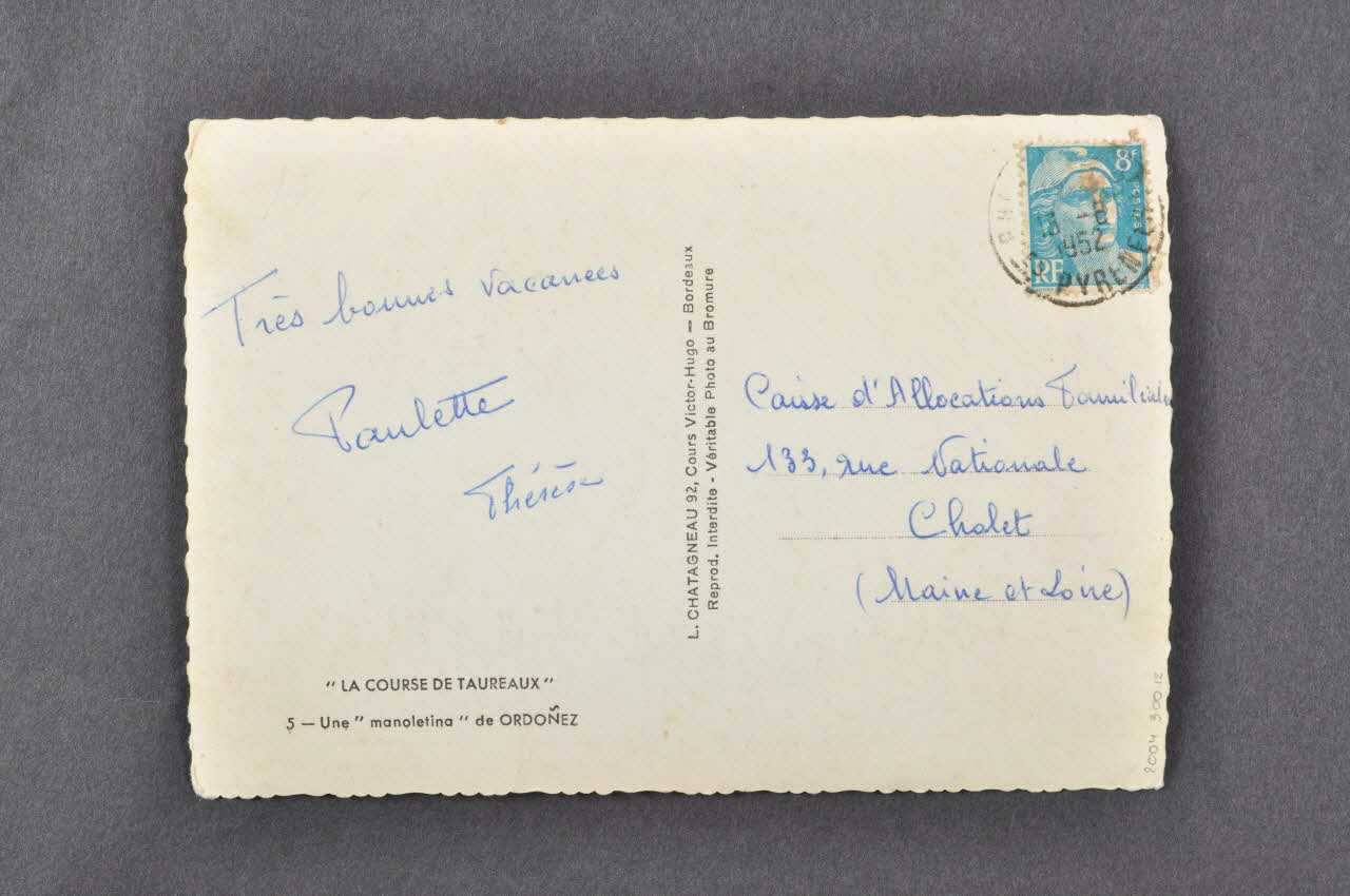 Carte postale présentant sur la face, la photographie noir et blanc d'un toréro faisant face à un taureau blessé. Des inscriptions sont présentes au dos, ainsi qu'un timbre français présentant la tête d'une Marianne à l'encre verte.Inscriptions