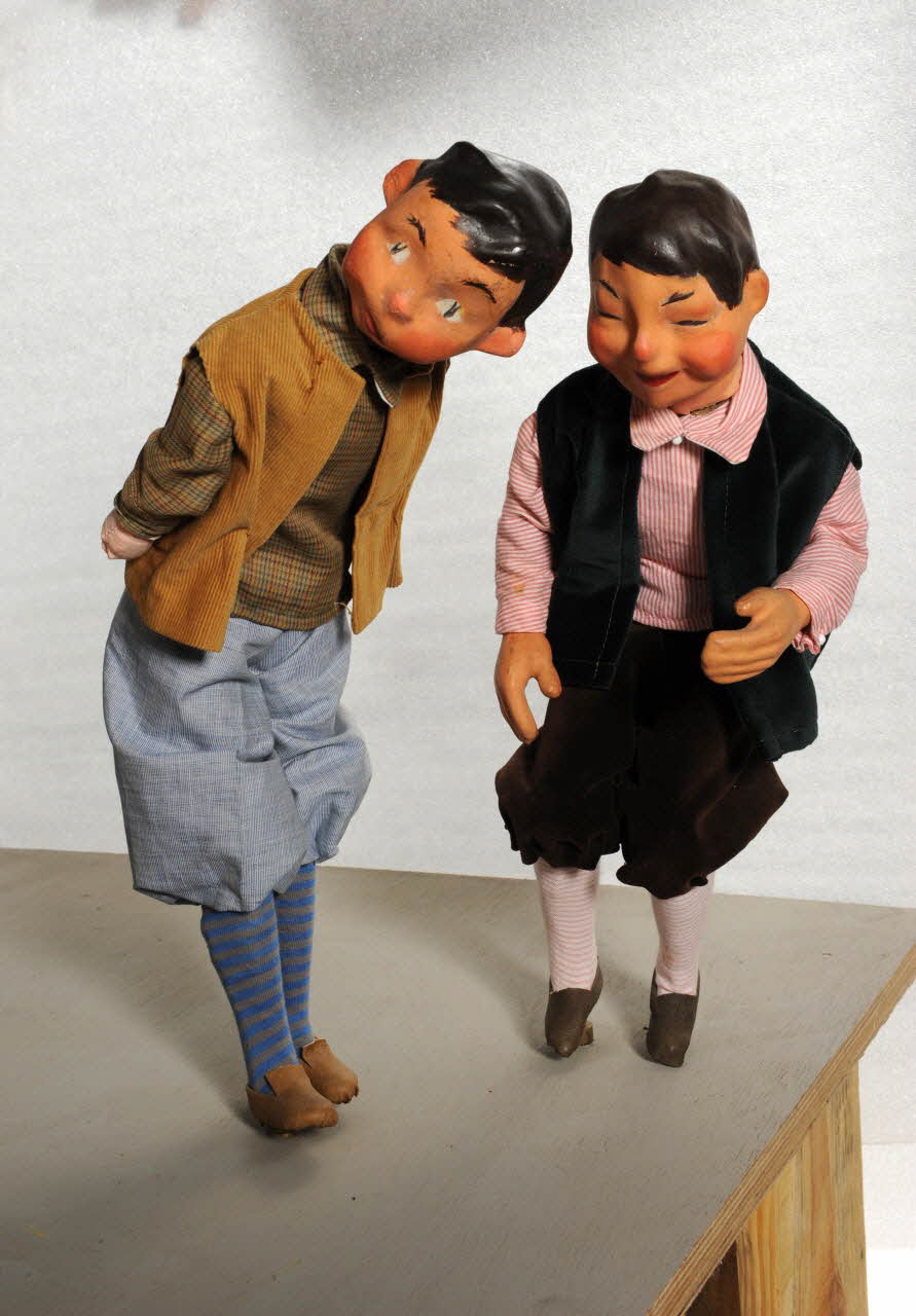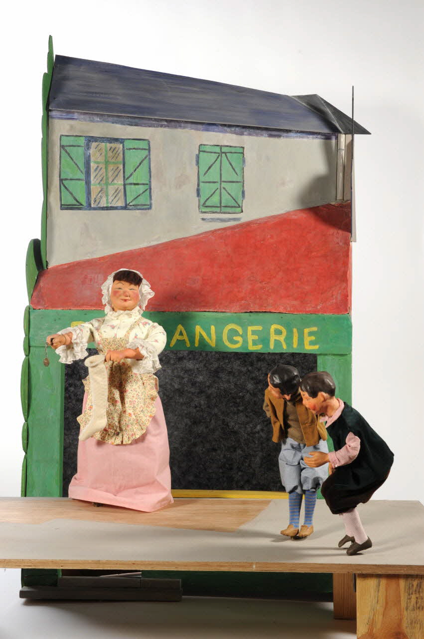 Dans un décor de façade de boutique, la boulangère est debout et présente un écu. Deux personnages enfants sont devant.Dimensions et poids