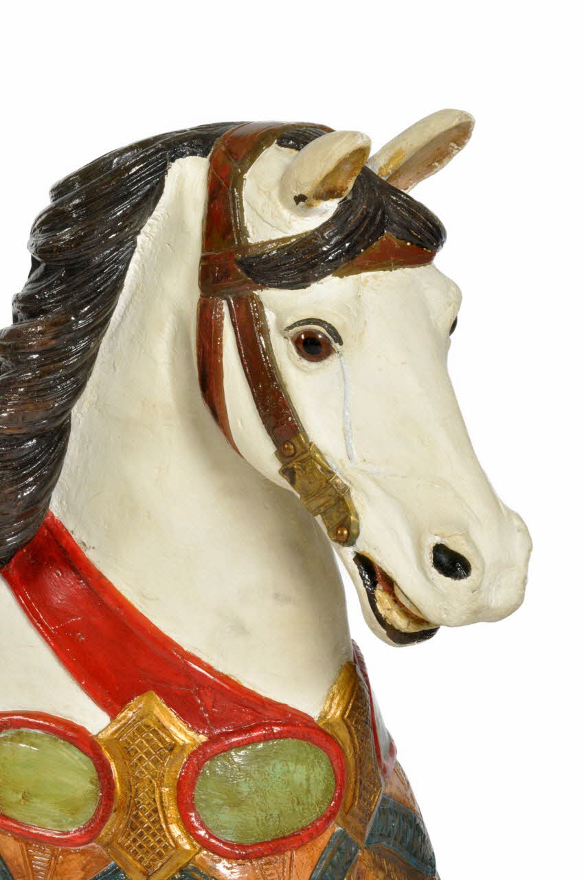 Cheval blanc bondissant sur se deux pattes arrières reliées par un socle en bois. Il est en bois sculpté, assemblé et peint sur toute la surface.