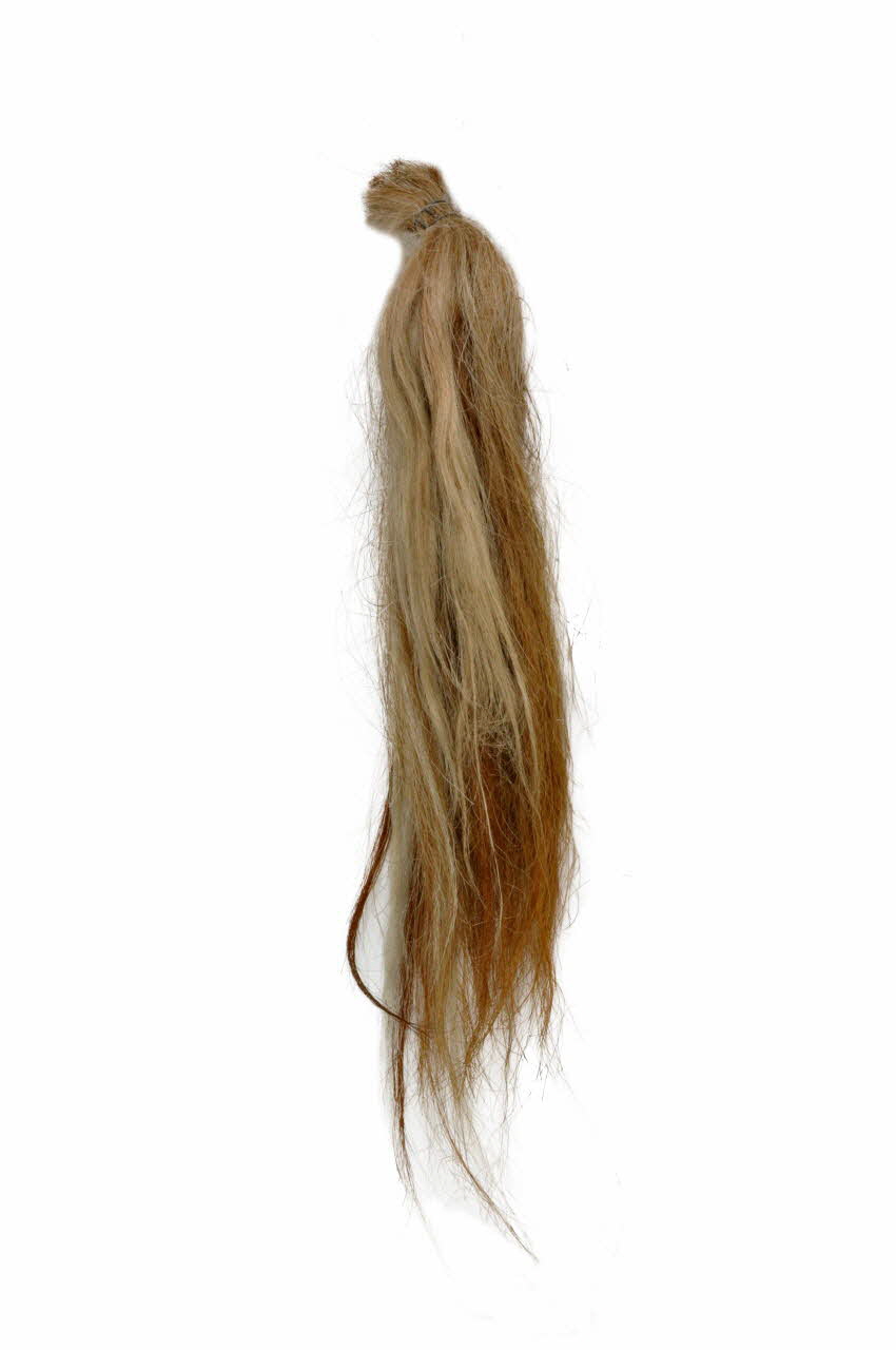 Sur le dos, il porte une selle marron avec un aigle doré sculpté en haut relief à l'arrière. Le tapis de selle rouge, orné d'une bordure bleue en bas relief présentant un décor en damnier. La lanière de fixation de la selle est peinte en brun. De part et d'autre du cheval, en dessous du tapis de selle se trouvent deux anneaux de fer rectangulaires pour fixer les étriers (disparus) Le cheval, est orné sur les épaules et à l'arrière train, d'un collier richement décoré avec des médaillons vers cernés de rouge altérnés avec des motifs chantournés dorés. Des triangles roses à bordure bleue en bas relief et à décor géométrique, ornent la partie inféirieure. Ils sont bordés de franges de pasementerie dorées. Un collier rouge en bas relief habille le cou. Il est perforé en dessous au niveau du poitrail. Le frein est sculpté en bas relief accompagné d'une plaque en cuivre de chaque côté du museau pour fixer les rênes (disparus) La queue (1991.2.23.2) désassemblée de l'ensemble est composée de crin de cheval cendrés fixé par deux fils de fer à une extrémité.Matériaux et techniques