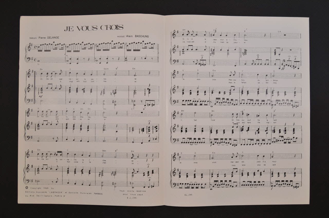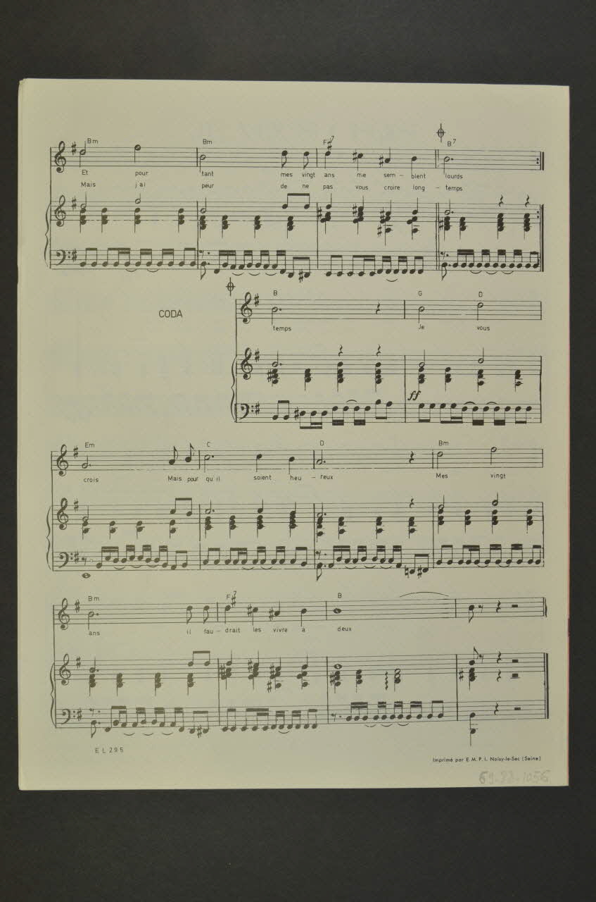 Les inscriptions renseignent le titre de la chanson, le nom des auteurs, de l'artiste et de l'éditeur. L'intérieur et le dos présentent la partition et les paroles.Matériaux et techniques