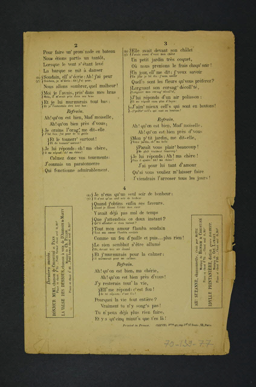 Les inscriptions renseignent le titre de la chanson, le nom des auteurs, de l'artiste et de l'éditeur. A l'intérieur, la partition et les paroles de la chanson. Au dos, les paroles.Matériaux et techniques