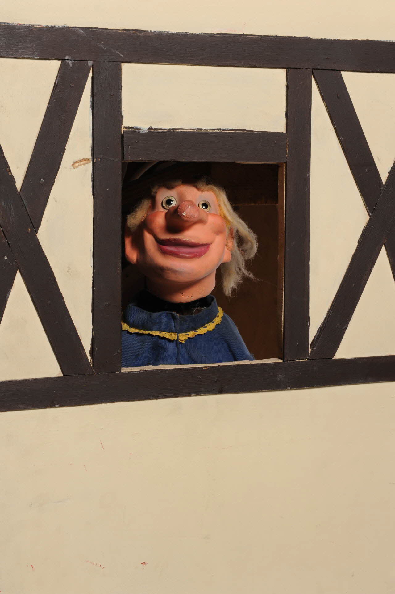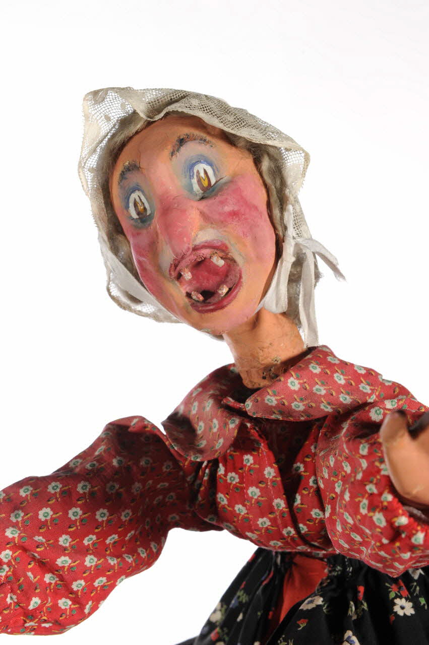 Bonnet de toile de coton blanc bordé de dentelle de coton mécanique imitation fuseaux avec rubans d'attache en soie ou viscose. Jupe en toile de coton rouge, sur-jupe en toile de coton imprimée sur fond noir de fleurs multicolores rouge, blanc, vert et bleu. Corsage en toile de coton imprimée sur fond rouge de fleurs blanches avec fermeture par bandes Velcro (nylon?) milieu devant. / tuiles du toit en carton peint en marron, le reste de la maison est en bois peint à l'extérieur : murs beiges, colombages marrons, volets verts. / La Mère Michel à la fenêtre de sa maison lève les bras au ciel et cri. A l'intérieur de la maison gesticule un personnage à la fenêtre.Décor