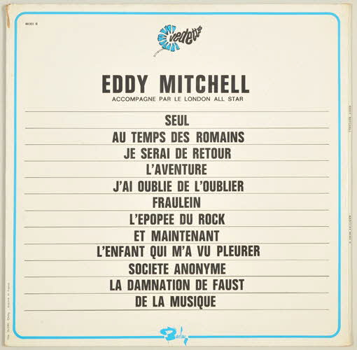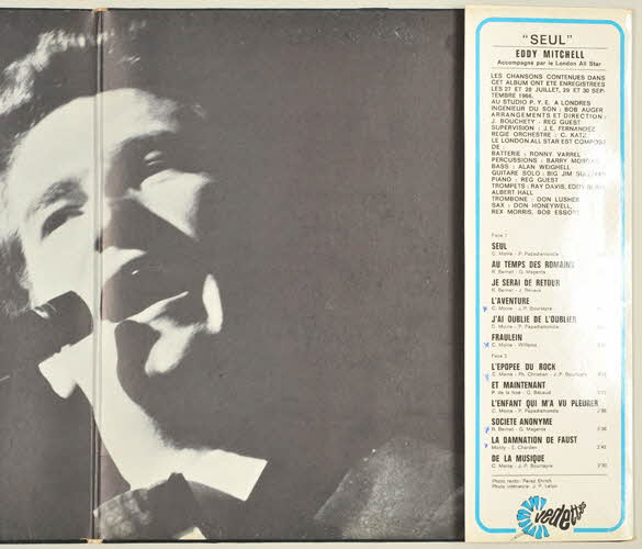De : Date : 1966les chansons de l'album ont été enregistrées les 27 et 28 juillet, 29 et 30 septembre 1966 au Studio PYE à Londres / basse / trompette / trombone / Eddy Mitchell est accompagné par le London All Stars composé des 12 musiciens mentionnés ci-dessous / percussions / trompette / saxophone / régie d'orchestre / guitare solo / supervision / batterie / trompette / piano // arrangements et direction / ingénieur du son / saxophone / saxophone / arrangements et direction / maison de disques / photographie intérieure de la pochette / photographie recto de la pochette