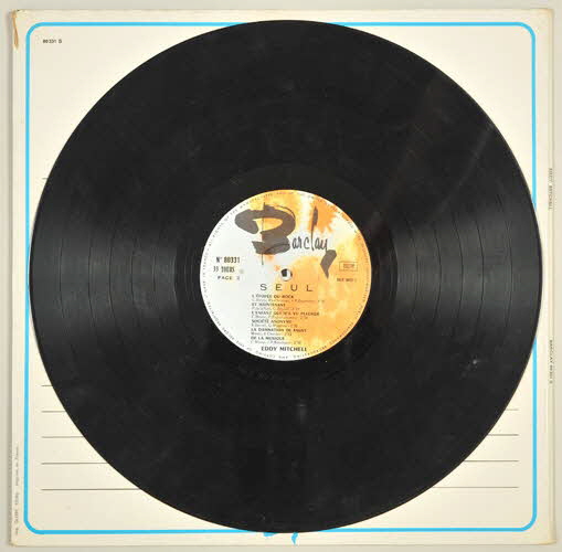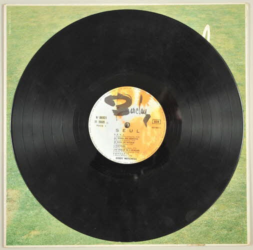 disque en vinyle de couleur noire / pochette en carton / pochette double avec rabat à l'intérieur sur lequel sont mentionnés le nom des participants, le titre des chansons et le nom des photographes - au recto de la pochette, photographie en couleur d'Eddy Mitchell assis sur un banc placé au milieu d'un champ d'herbe verte et rase - à l'intérieur de la pochette, photographie en noir et blanc du visage d'Eddy Mitchell tenant un micro et en train de chanter - au dos de la pochette, inscriptions linéaires portant sur le titre des chansons, le nom de l'artiste et du London All Star, le nom de la maison de disques, la référence de l'album et l'indication de la collection "Vedettes" / disque de couleur noire - motif dans les tons de jaune et orange et signature spécifique de la maison BarclayInscriptions