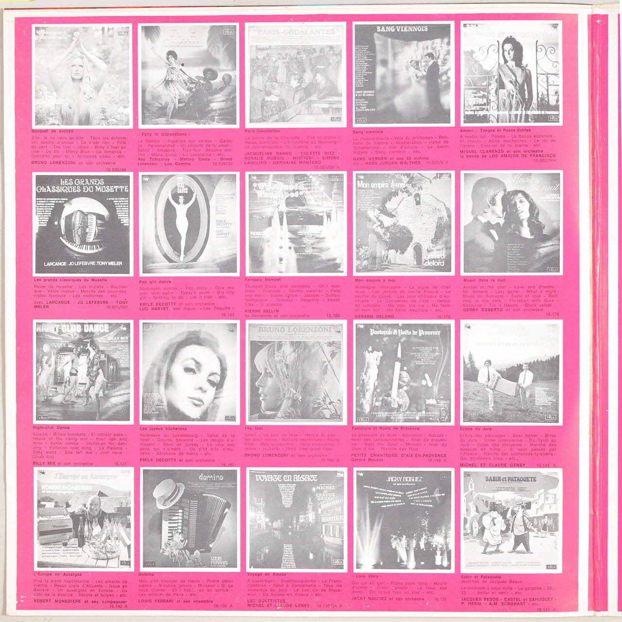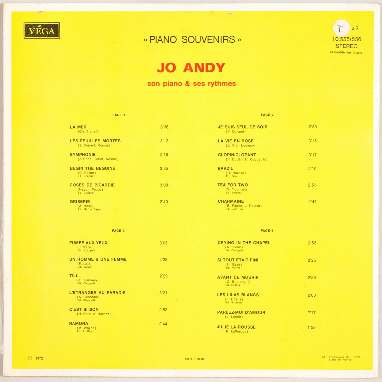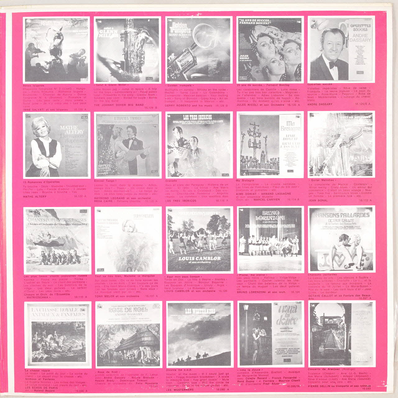 disque 33 tours, Clopin-Clopant, Crying in the chapel, Roses de Picardie (Roses of Picardy), Julie la rousse, Till, Piano souvenirs, Si tout était fini, L'étranger au paradis, Tea for two, Un homme et une femme, Avant de mourir, Begin the beguine, Parlez-moi d'amour, La mer, Je suis seul ce soir, Brazil, Charmaine, Ramona, Fumée aux yeux, Griserie, Les feuilles mortes, Les lilas blancs, La vie en rose, C'est si bon !, Symphonie