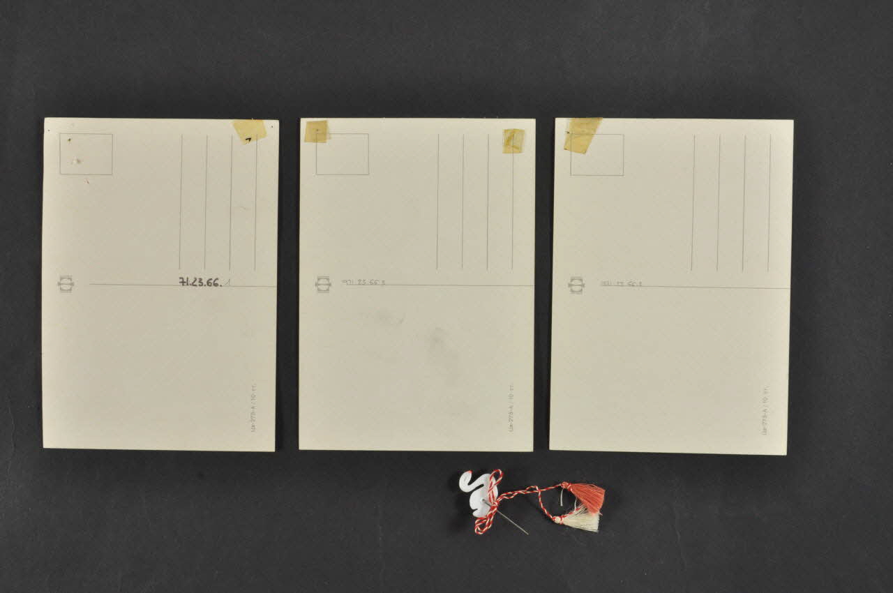 Lot de trois cartes postales rectangulaires identiques, en papier, représentant la photographie de trois perce-neige. Les cartes sont accompagnées d'une épingle en métal, surmontée d'une cordelette garnie d'un petit canard en plastique.Matériaux et techniques