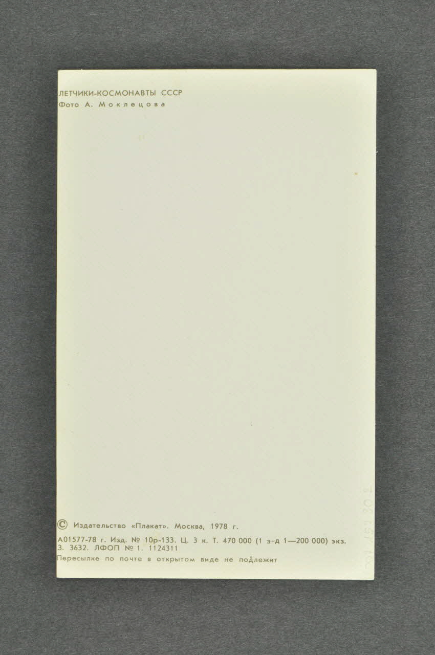 Carte rectangulaire, en papier cartonné, présente la photographie de Gagarine, en tenue militaire de cosmonaute.Inscriptions