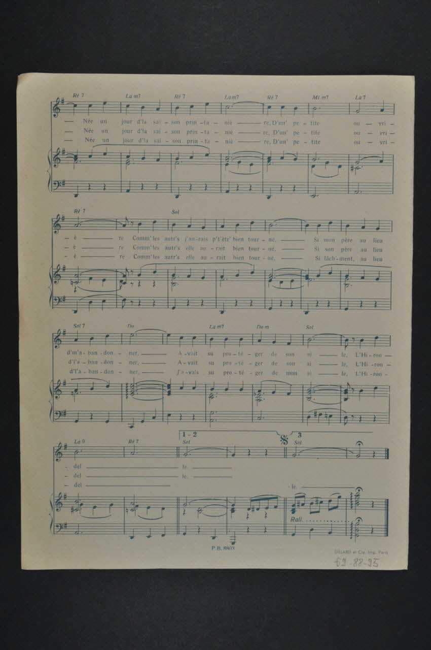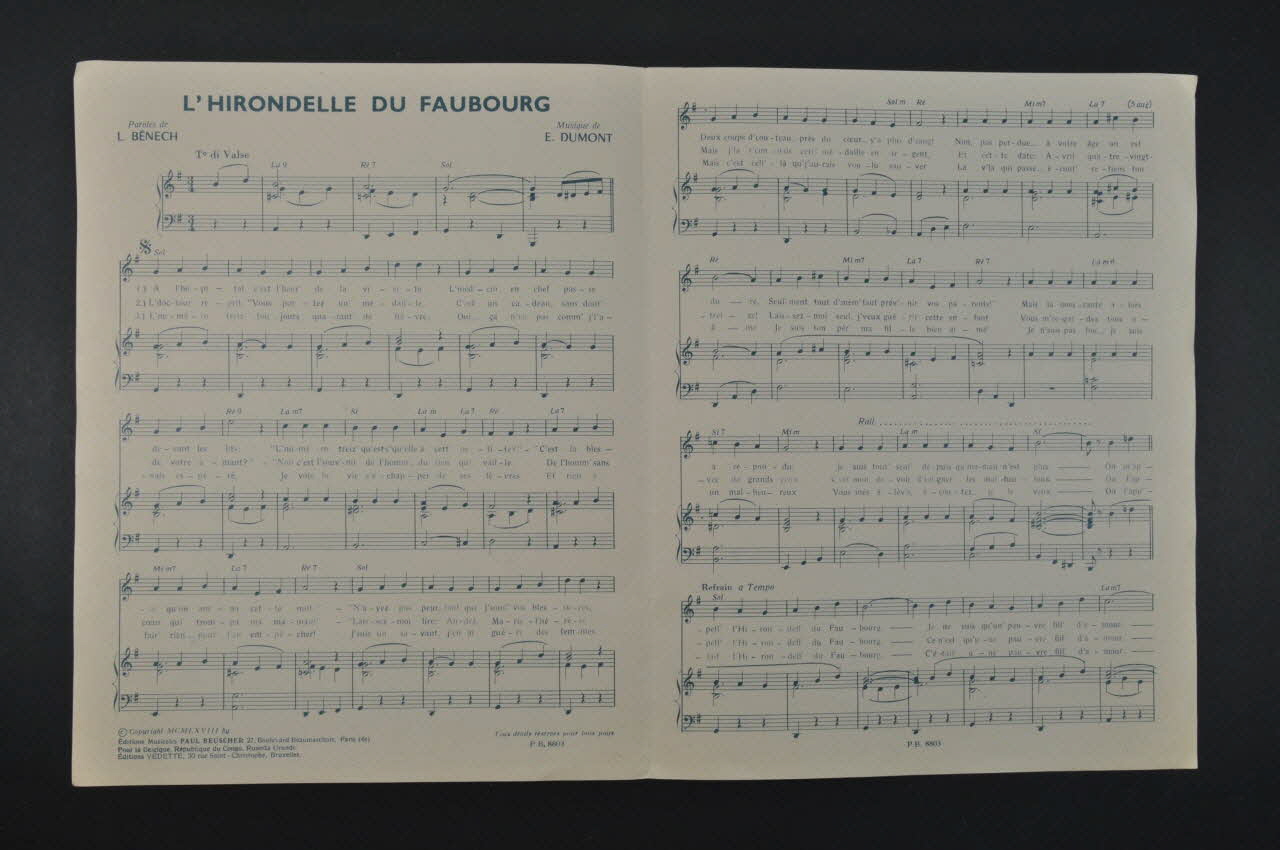 Des inscriptions renseignent le titre, les auteurs, les exécutants et l'éditeur. A l'intérieur et au dos, la partition et paroles de la chanson.Matériaux et techniques