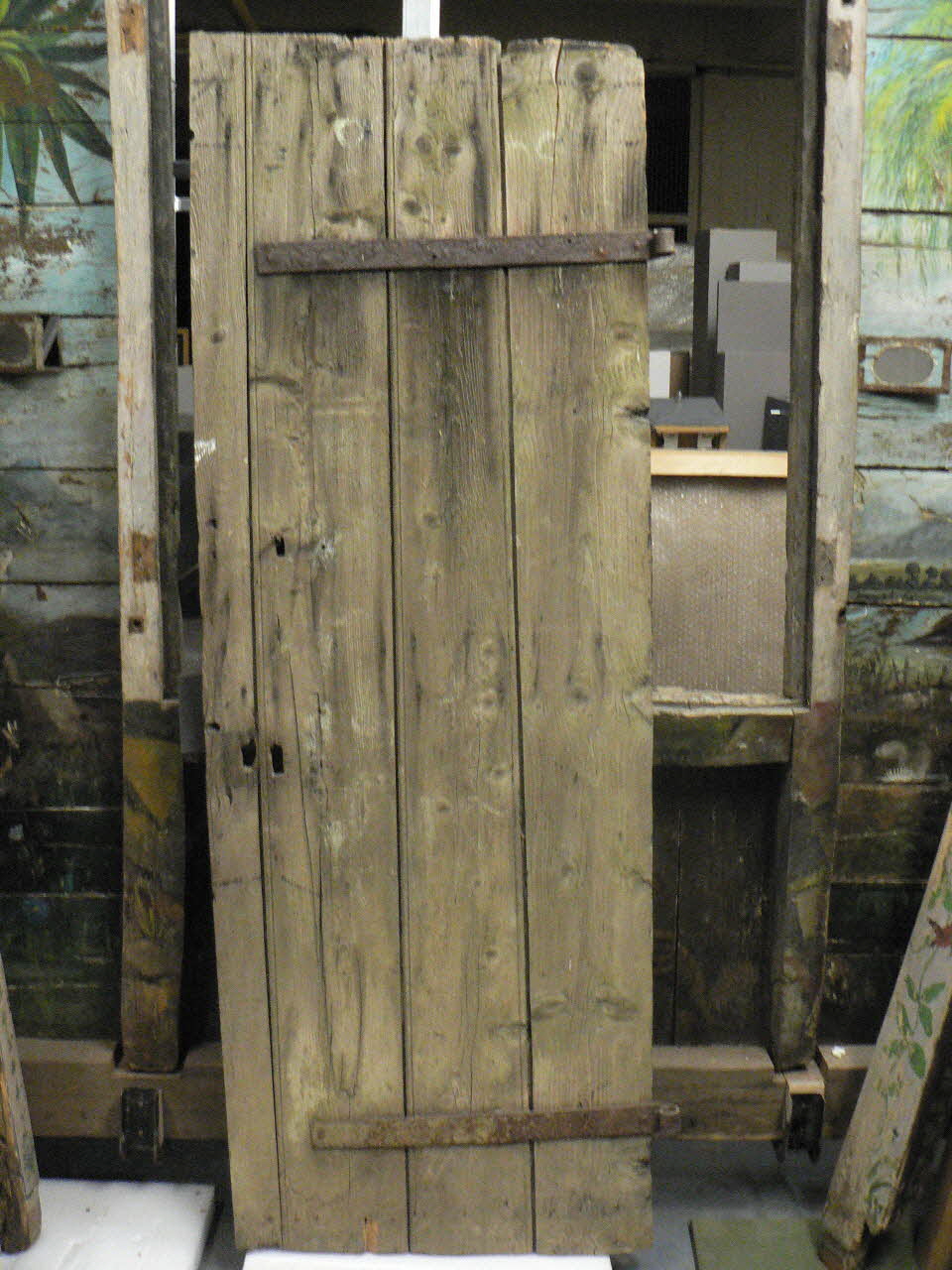 La porte est réalisée en 4 planches verticales assemblées à rainure et languette et 3 traverses sont clouées horizontalement. Elle comporte 2 anneaux sur les gonds, une poignée et un système d'ouverture à crochet. L'intérieur de la porte présente un décor peint polychrome composé d'un trophée de tête de cerf naturalisée dans la partie haute, d'un cor de chasse et une dague/épée dans la partie basse sur fond de paysage.Décor