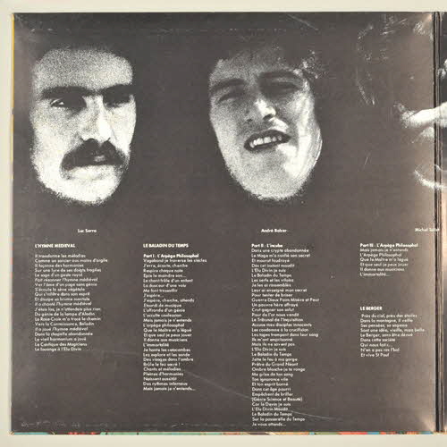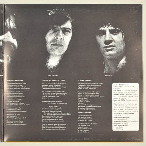 plastique transparent / pochette / disque en vinyle / pochette double - au recto de la pochette, dessin psychédélique où l'on distingue, entre autres, divers personnages, des femmes, des animaux imaginaires, des instruments de musique et de la végétation - au verso de la pochette, photographie en couleur des cinq musiciens à l'intérieur d'un cercle, portant tous les cheveux longs, sur fond jaune - à l'intérieur de la pochette, photographie en noir et blanc du visage des cinq musiciens, paroles des chansons sur fond noir et nom et fonction des personnes ayant participé à la réalisation de l'album