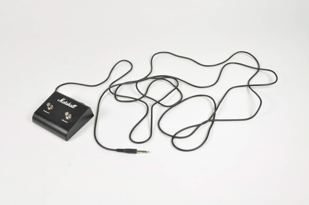 .1 : amplificateur. Caisse rectangulaire renforcée aux angles, contenant à la fois un préamplificateur et un amplificateur. L'avant est fermé par une grille de protection de couleur noire entourée d'un liseret blanc. Dans le bas figurent les réglages du préamplificateur sur fond de couleur jaune-or, avec deux interrupteurs dont un est lumineux, dix potentiomètres à baxandale, une entrée jack et une sortie pour pédale au pied. Sur le dessus est fixée une poignée en plastique noir, et une grille de ventilation de forme rectangulaire. A l'arrière, une grille de ventilation métallique est vissée, et surmonte une série de prises : une prise d'alimentation avec Terre, quatre sorties jack, un dispositif de choix de l'impédence. L'amplificateur repose sur quatre pieds circulaires évasés. L'inscription "Marshall" figure en lettres de plastique blanc sur la grille à l'avant. De nombreuses inscriptions accompagnent chaque sortie et bouton. .2 : baffle à pan, coupé - modèle pour guitare. L'avant est muni d'une grille. L'ensemble, en plastique noir, repose sur quatre roulettes et présente deux poignées sur les côtés. A l'arrière figurent deux sorties de cable. .3 : pédale, munie d'un boitier en plastique noir reposant sur un patin en mousse, duquel part une prise jack, se branche devant. Sur le dessus figurent deux interrupteurs en métal gris.Inscriptions