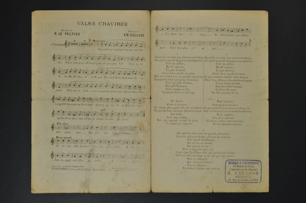 Les inscriptions renseignent le titre de la chanson, le nom des auteurs, de l'artiste et de l'éditeur. A l'intérieur, partitions et paroles de la chanson. Au dos, liste d?autres partitions publiées par l?éditeur.Matériaux et techniques