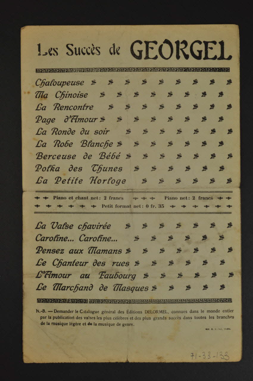 Feuillet rectangulaire en papier industriel, imprimé à l?encre noire. La couverture du feuillet présente la photographie de Georgel.