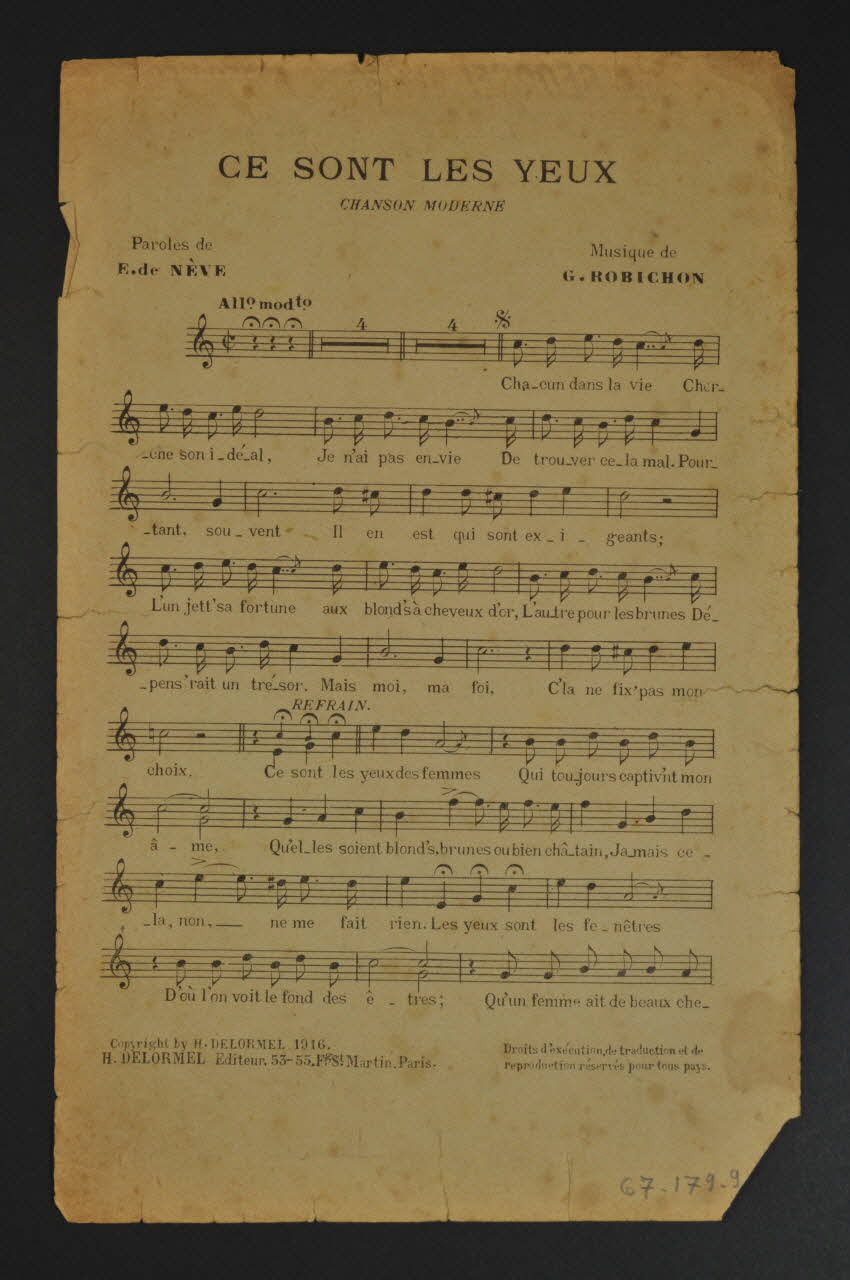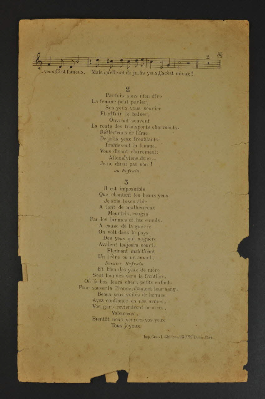 Les inscriptions renseignent le titre de la chanson, le nom des auteurs, de l'artiste et de l'éditeur. A l'intérieur, partitions et paroles de la chanson. Au dos, liste d?autres partitions publiées par l?éditeur.Matériaux et techniques