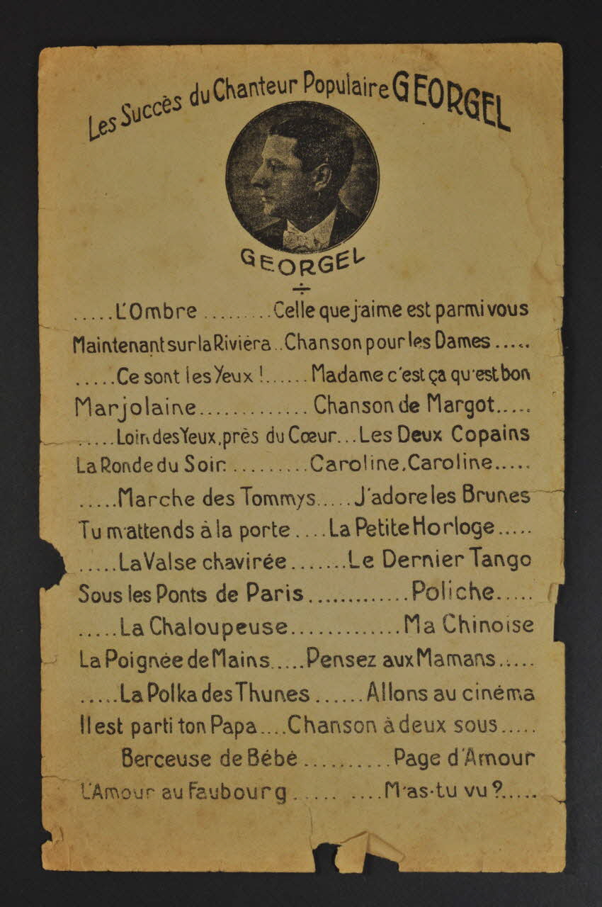 Feuillet rectangulaire en papier industriel, imprimé à l?encre noire. La couverture du feuillet présente la photographie de Georgel dans un médaillon et le dessin d'une jeune femme brunes aux longs cheveux.