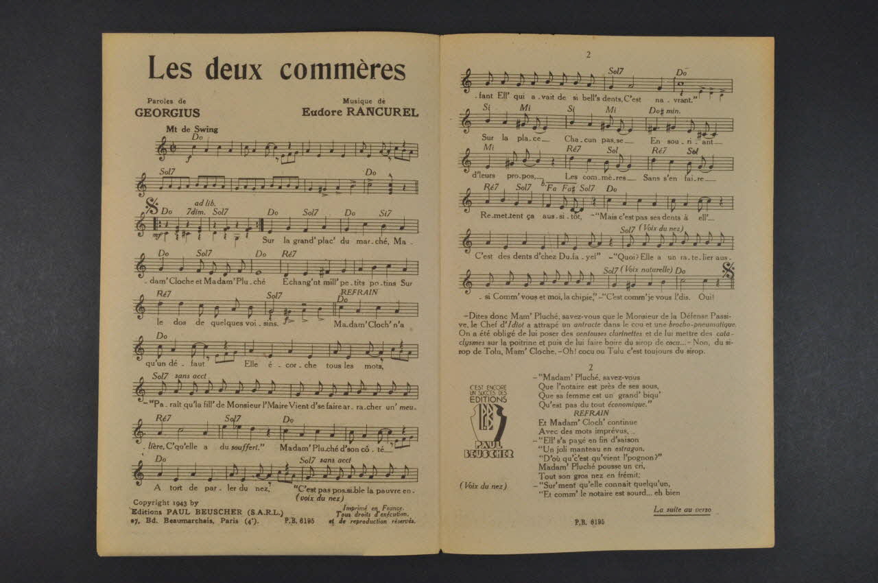 Des inscriptions renseignent le titre, les auteurs, les exécutants et l'éditeur. A l'intérieur, partition et paroles de la chanson. Au dos, liste d'autres partitions publiées par l'éditeur.Matériaux et techniques