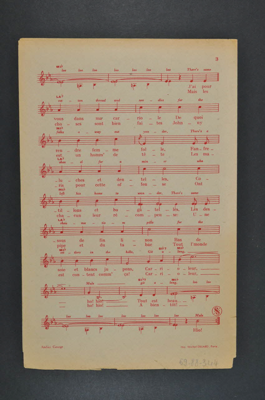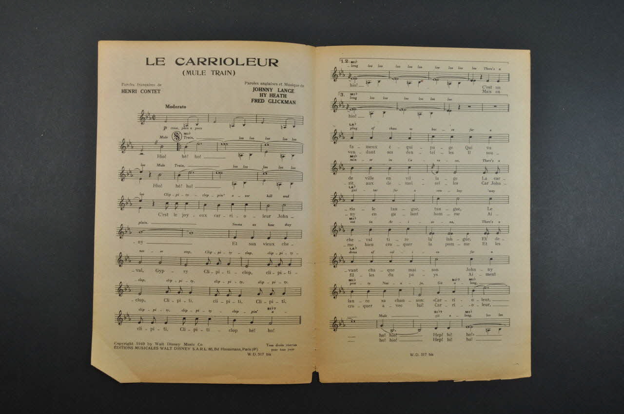 Les inscriptions renseignent le titre de la chanson, le nom des auteurs, de l'artiste et de l'éditeur. A l'intérieur et au dos, la partition et les paroles de la chanson.Matériaux et techniques