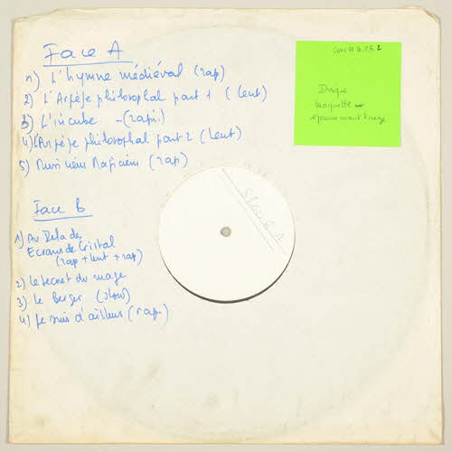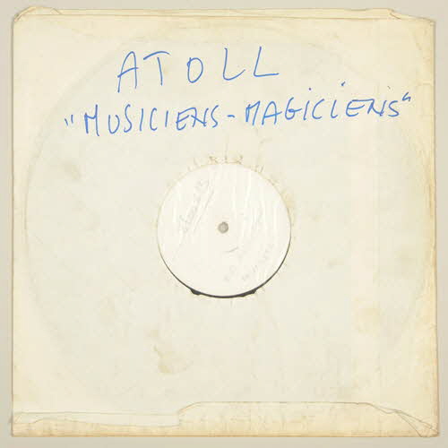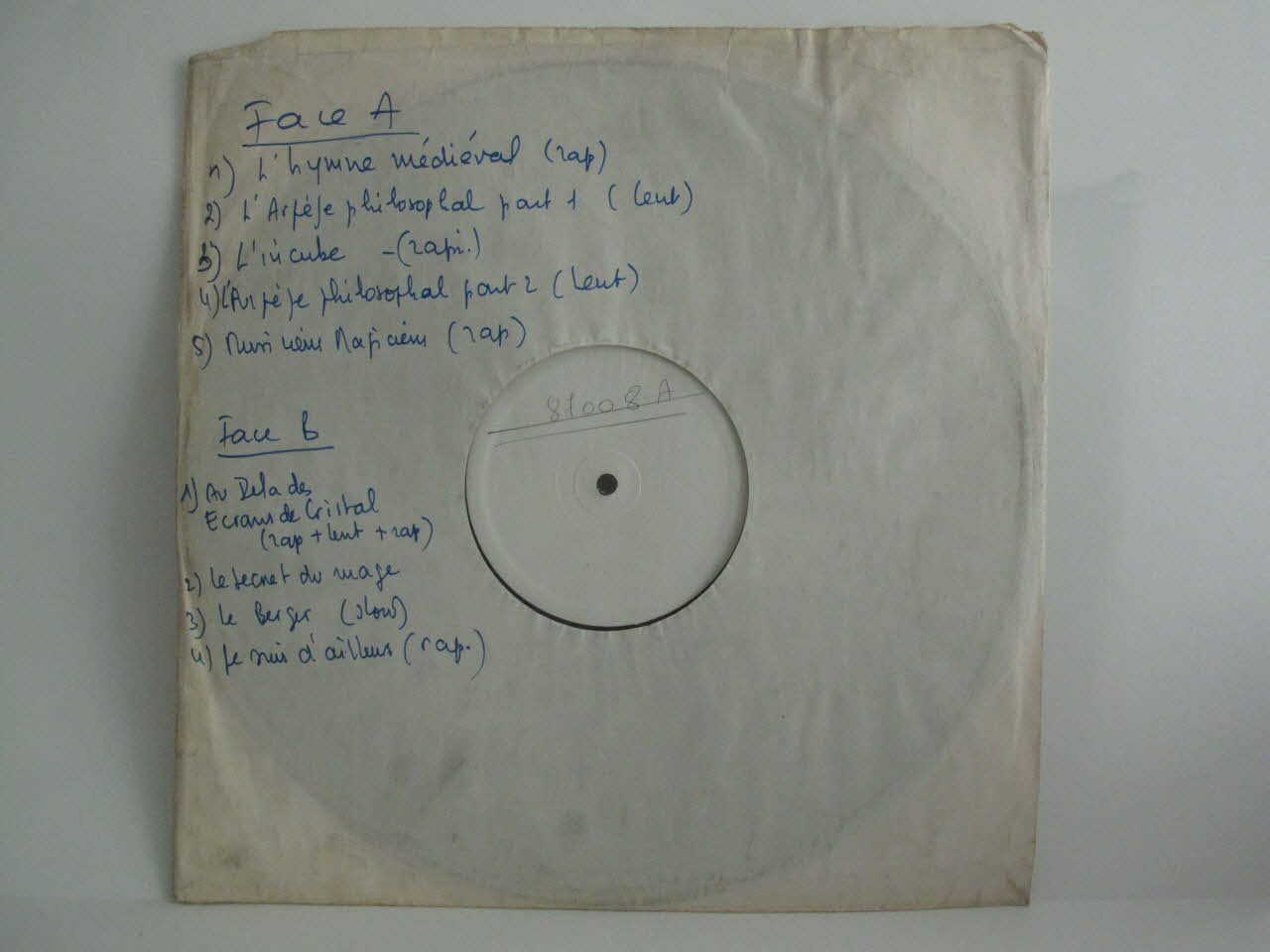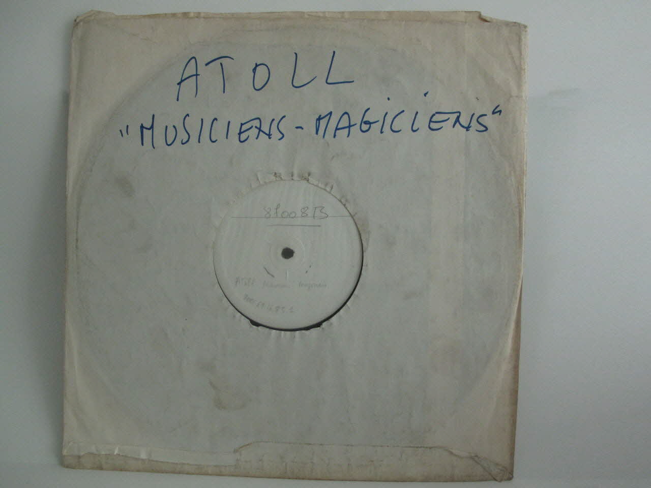 face A : // 1. L'hymne médiéval (rap) // 2. L'arpège philosophal part 1 (lent) // 3. L'incube (rapi.) // 4. L'arpège philosophal part. 2 (lent) // 5. Musiciens - Magiciens // // face B : // 1. Au-delà des écrans de Cristal (rap. + lent + rap.) // 2. Le secret du nuage // 3. Le berger (slow) // 4. Je suis d'ailleurs (rap.) (aucune inscription imprimée sur la partie centrale du disque)87008 A // 87 008 B // Atoll Musiciens - Magiciens (titre des chansons inscrites au stylo bleu sur l'enveloppe de protection en papier)(inscription au stylo et au crayon à papier sur la partie centrale du disque)Décor