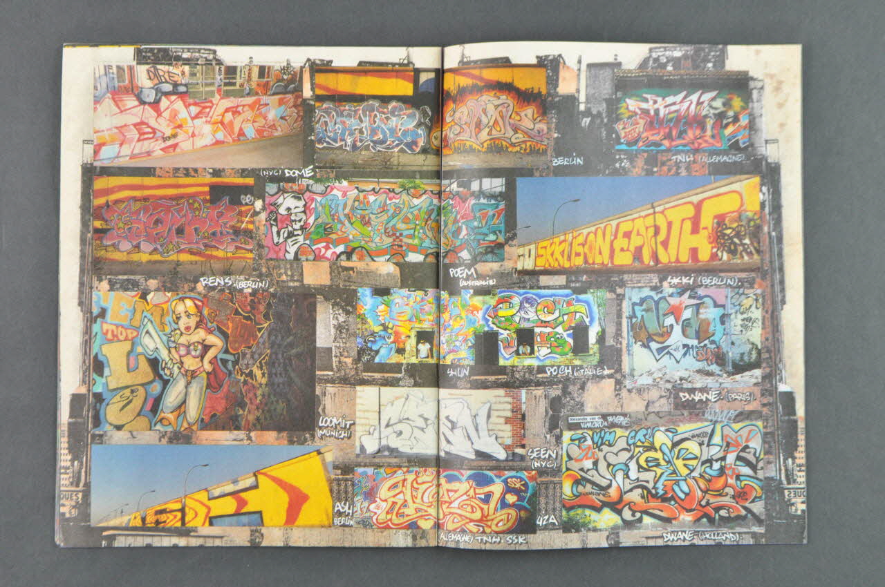 La couverture présente un détail d'un mur en pleine page. Dans l'angle supérieur gauche, il y a le titre du magazine sur une plaque de nom de rue. Le contenu du magazine est mentionné en blanc dans la partie inférieure gauche. La bordure gauche présente une bande bleu avec le prix, le numéro, la date du magazine et son titre. Il y a quatre bonhommes blancs levant la main droite dans la partie inférieure. Le verso présente une publicité pour des cigarettes. Les pages intérieures présentent un texte en sur-impression d'images et illustrés par de nombreuses photographies notamment de fresques. Ce numéro contient un témoignage d'Epsilon Point, une rubrique consacrée aux questions des lecteurs, une fiction intitulée "permis de tagger", plusieurs pages consacrées au dernières sorties musicales en lien avec la culture urbaine, une histoire du Skate rock, de courts articles sur l'actualité politique du moment en lien avec la culture urbaine (changement du prix des amendes pour taggages, etc.), un entretien avec Zebster.Inscriptions