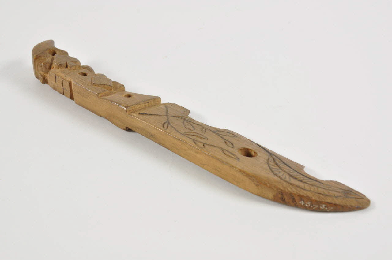 Bois sculpté et gravé. / En bois, en forme de couteau, percé de quatre trous et à deux encoches sur la lame. Décor représentant un soleil et des végétaux sur la lame. Manche terminé par un double crochet et orné de boules, d'un pique, d'un carreau, d'un coeur et d'un trèfle sculptés.Matériaux et techniques