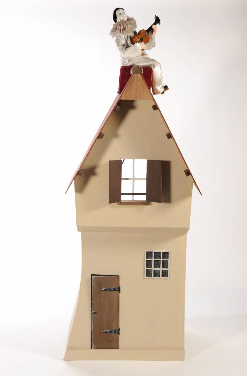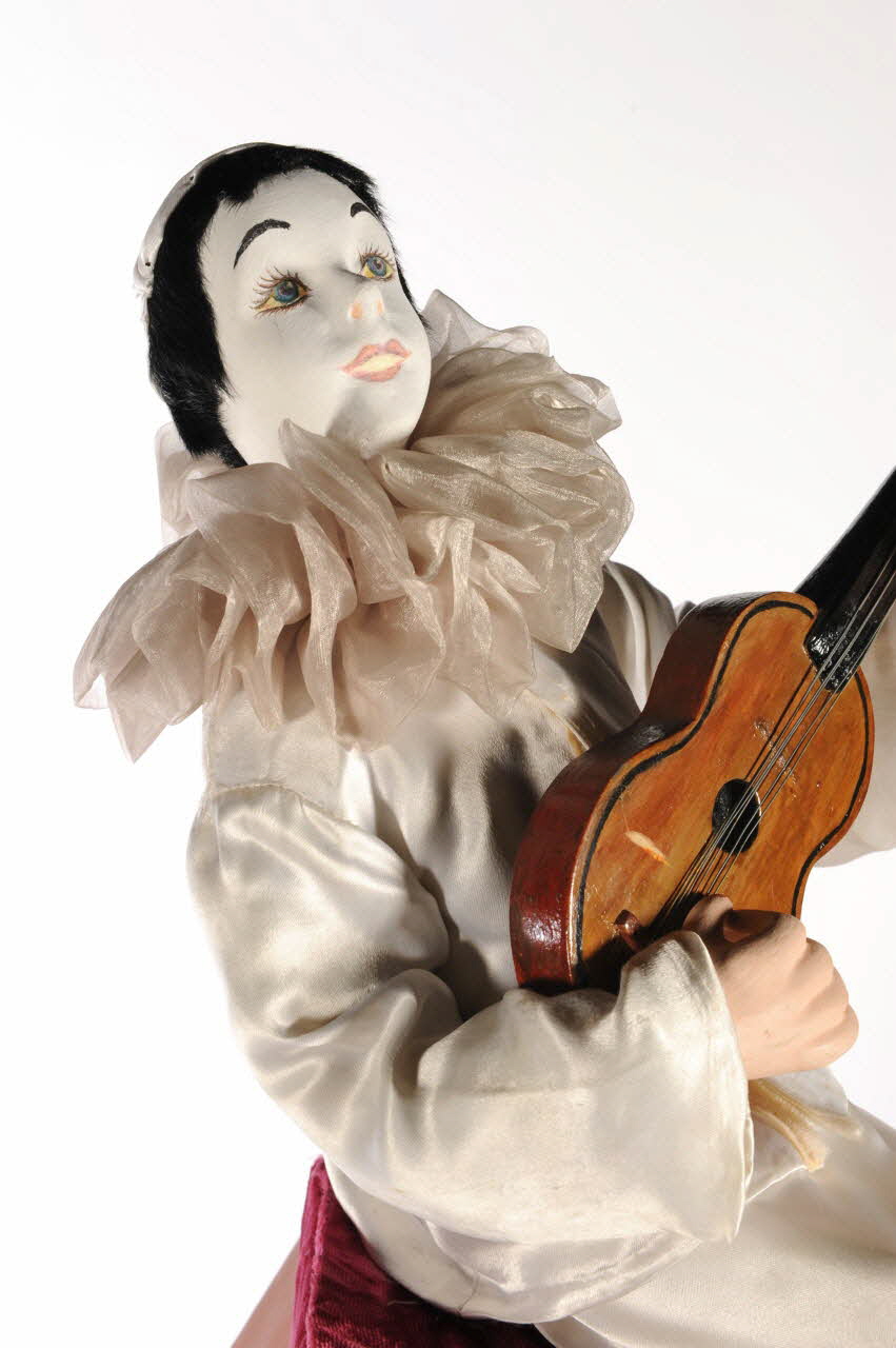 Tunique et pantalon en satin blanc avec fermeture milieu devant et dos par bandes velcro. Chaussures de cuir marron cousues sur les pieds avec boutons recouverts de tissu noir avec des fibres de lurex. L'un des boutons est en fer. / Col de Pierrot en voile rose pâle fermant par des agrafes (l'une en fer, l'autre en laiton sans doute chromé). / La boite abritant le moteur et le mécanisme de Pierrot / Guitare fictive / Pierrot joue de la guitare.Décor