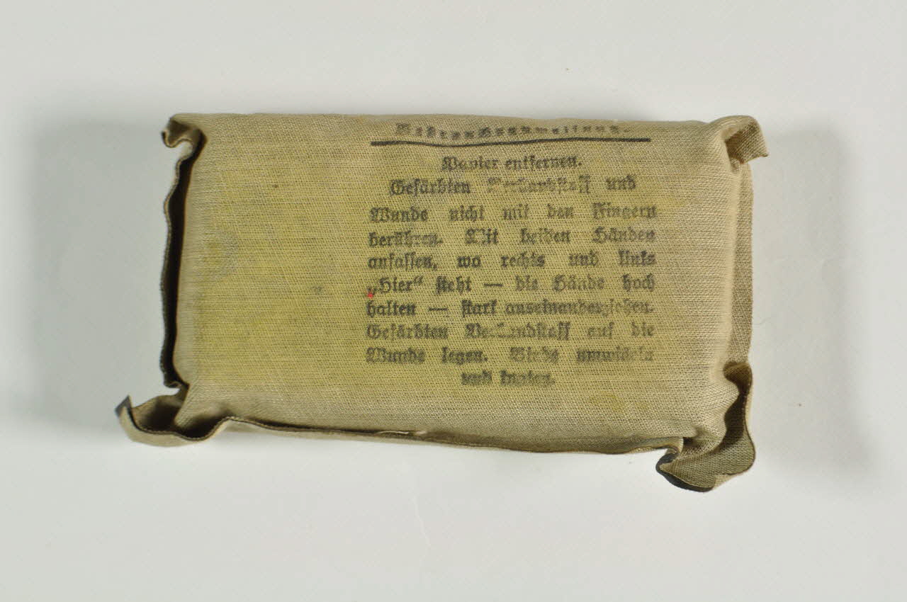 Compresses en gaze tissée contenues dans une emballage en toile de coton collée portant des inscriptions allemandes en lettres gothiques sur ses deux faces. L'une des faces est très difficile à déchiffrer.Matériaux et techniques
