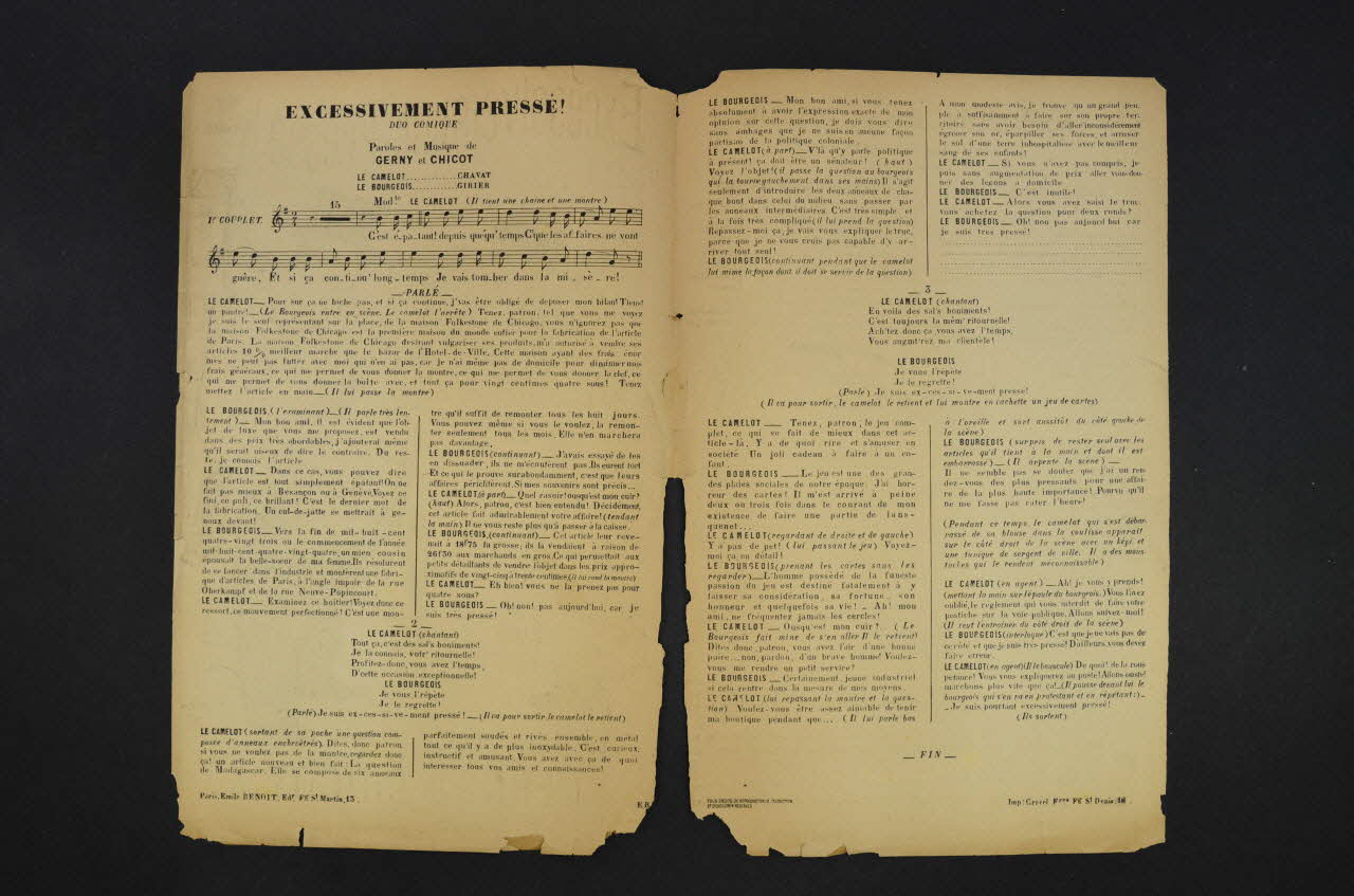 Des inscriptions renseignent le titre, les auteurs, les exécutants et l'éditeur. A l'intérieur, partition et paroles de la chanson. Au dos, liste d'autres partitions publiées par l'éditeur.Matériaux et techniques