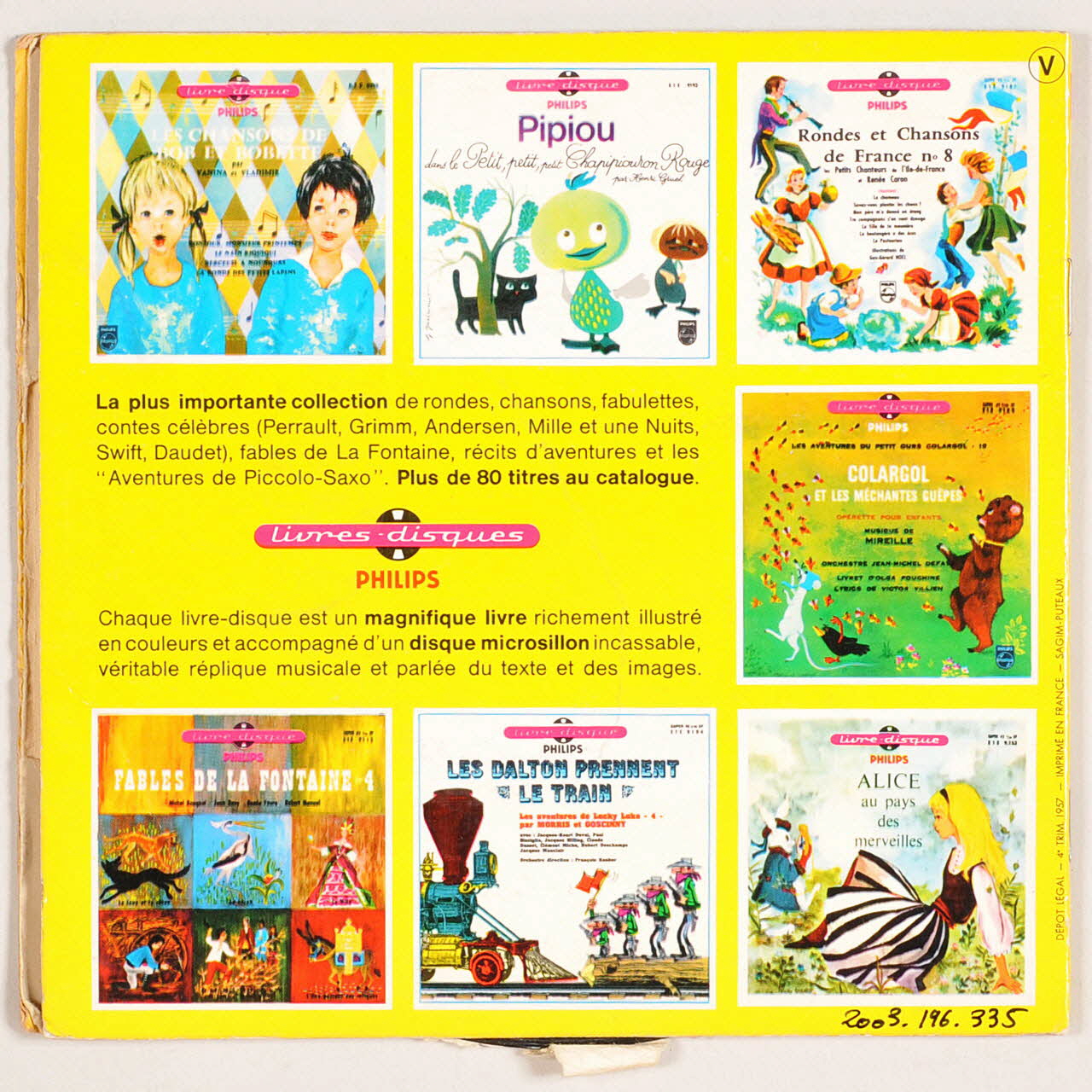 Au verso de la pochette, des autres albums de la collection. Le disque vinyle présente, sur les deux faces, une étiquette circulaire en papier bleu avec des inscriptions noires.Matériaux et techniques