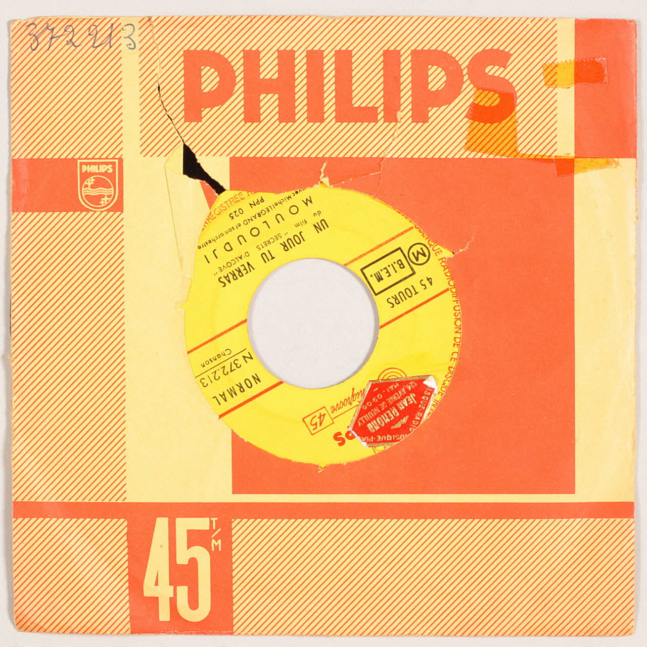 Le logo de la marque est inscrit en rouge sur un fond beige sur les deux faces. Au centre du vinyle, sur les deux faces, une étiquette ronde en papier imprimé de couleur jaune, avec des inscriptions noires et rouges.Inscriptions