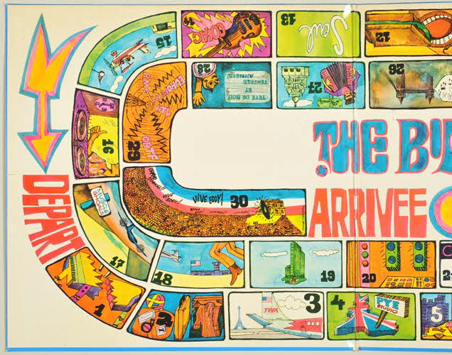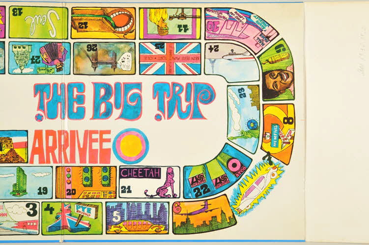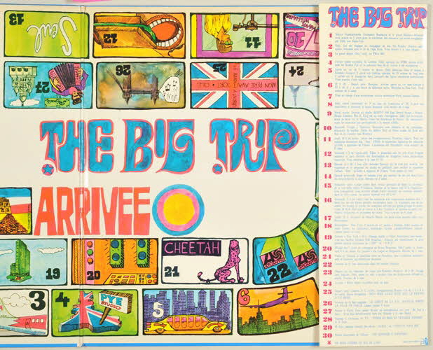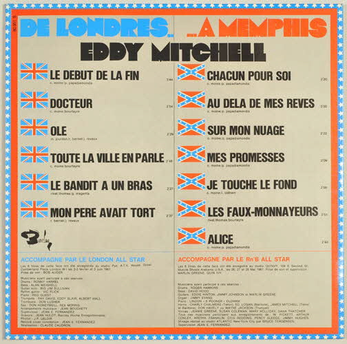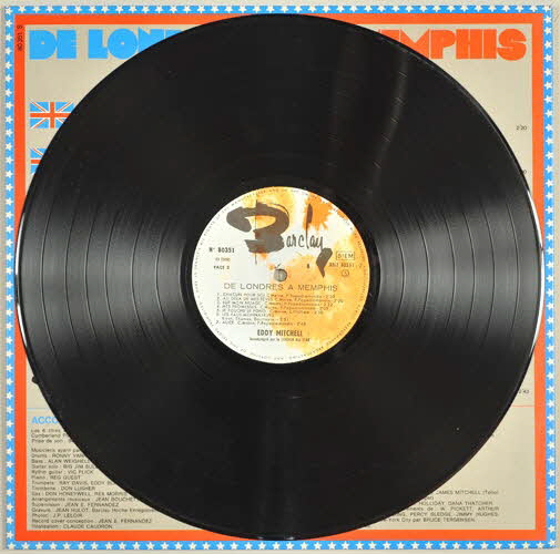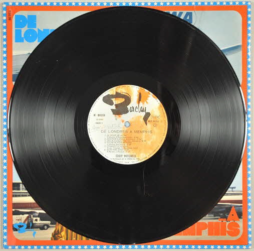 enveloppe de protection en papier / pochette en carton / disuqe en vinyle / pochette double - au recto, deux photographies d'Eddy Mitchell avec en second plan des avions pour illustrer son voyage et l'histoire de son album de Londres à Memphis - à l'intérieur de la pochette, dessin très coloré d'un jeu de l'oie dont la succession de cases raconte l'histoire de l'album, de sa création à sa sortie - un rabat à droite reprend chaque numéro de case et les évènements sont expliqués chronologiquement - le dos de la pochette présente deux colonnes : à gauche la distribution de la partie londonienne et à droite la distribution de la partie américaine / disque vinyle de couleur noir - motif dans les tons de jaune et orange et signature spécifique de la maison Barclay.Inscriptions