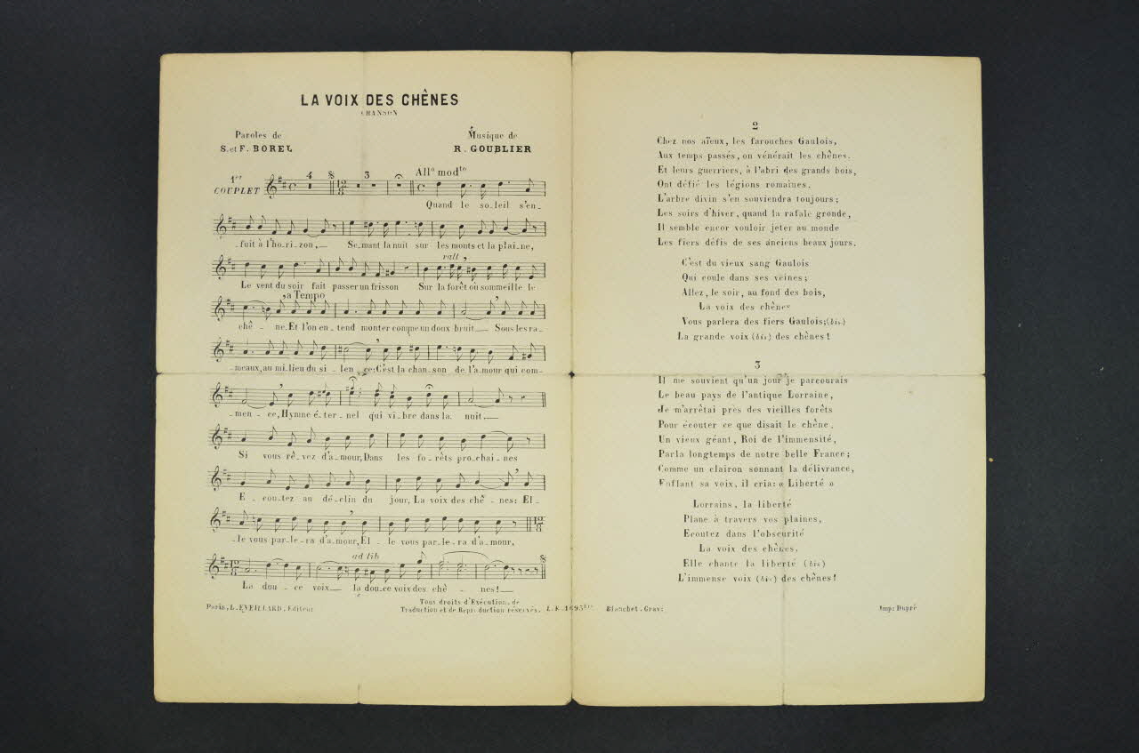 Des inscriptions renseignent le titre, les auteurs, les exécutants et l'éditeur. A l'intérieur, les paroles et la partition. Au dos, une liste de titres disponibles chez le même éditeur.Matériaux et techniques
